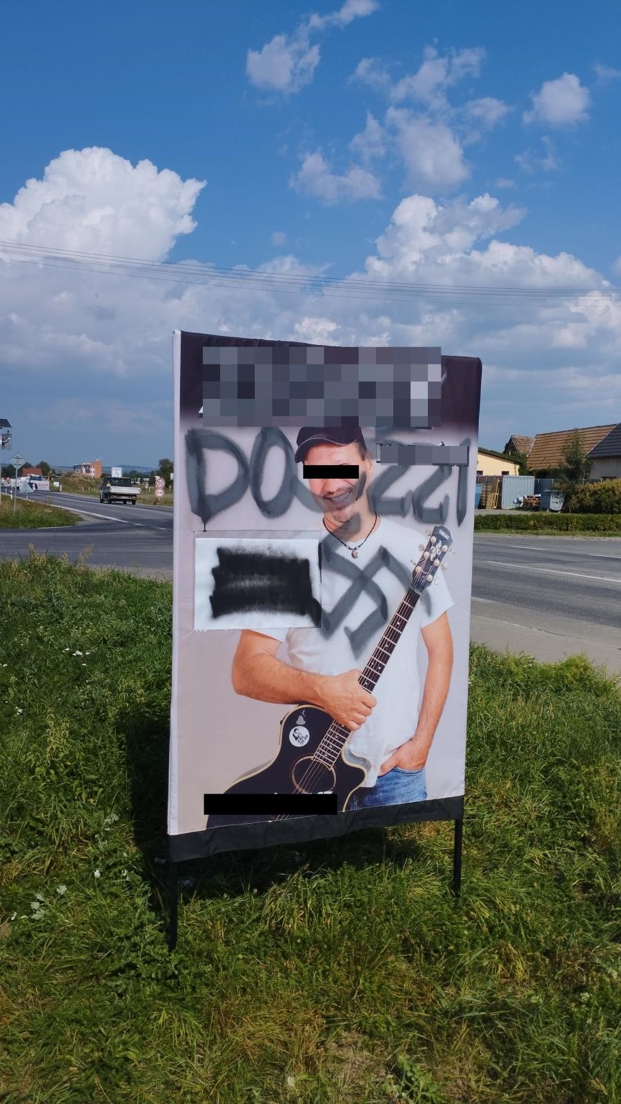 Neznámý pachatel poničil předvolební bannery a nasprejoval na ně hákový kříž