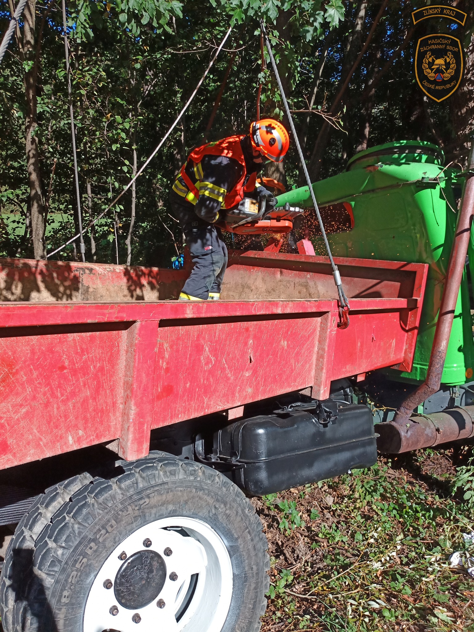 Zasahující hasiči stabilizovali poškozené vozidlo proti pohybu, a to především v prostoru značně poškozené kabiny. Dále u auta provedli protipožární opatření.