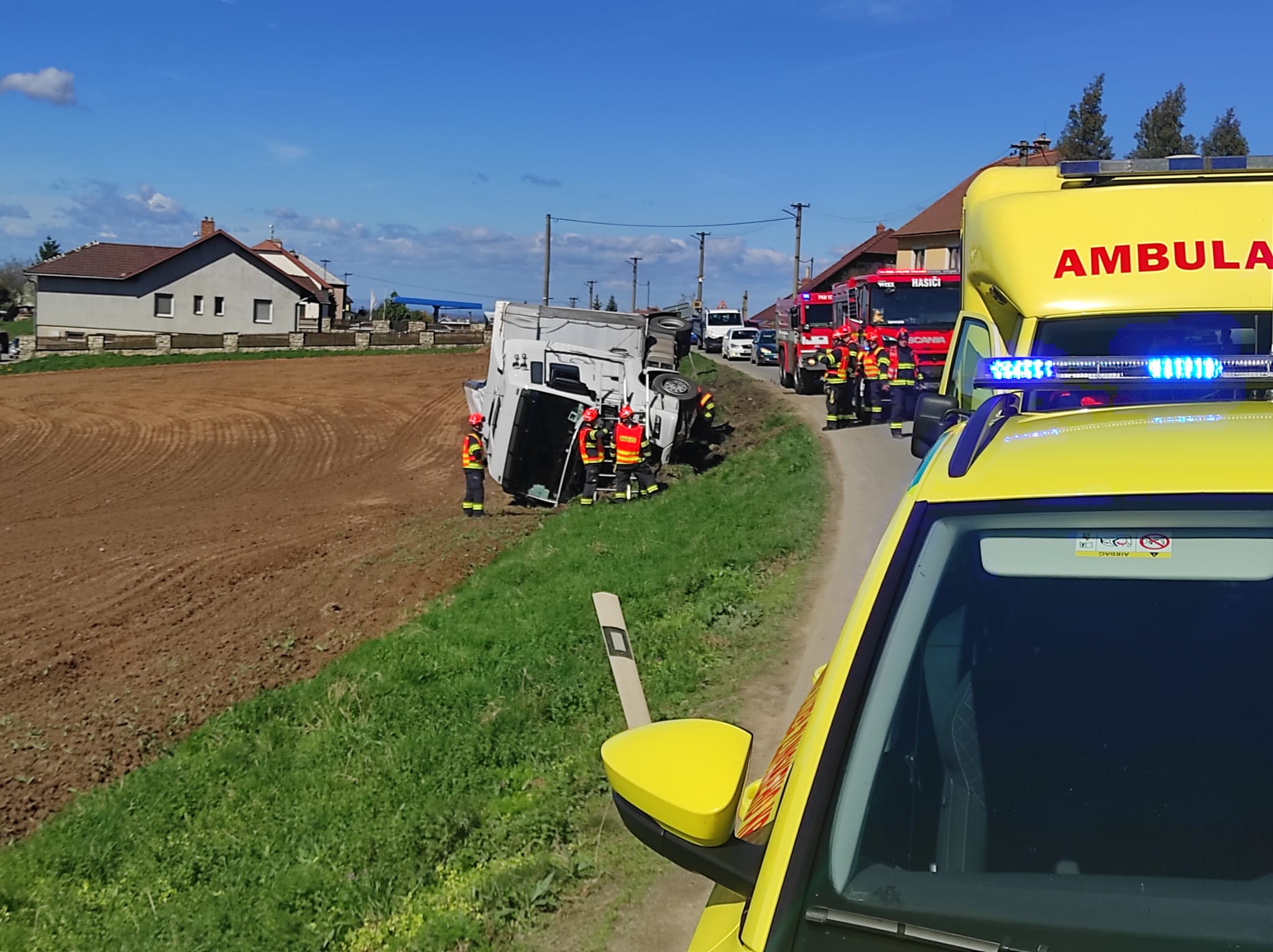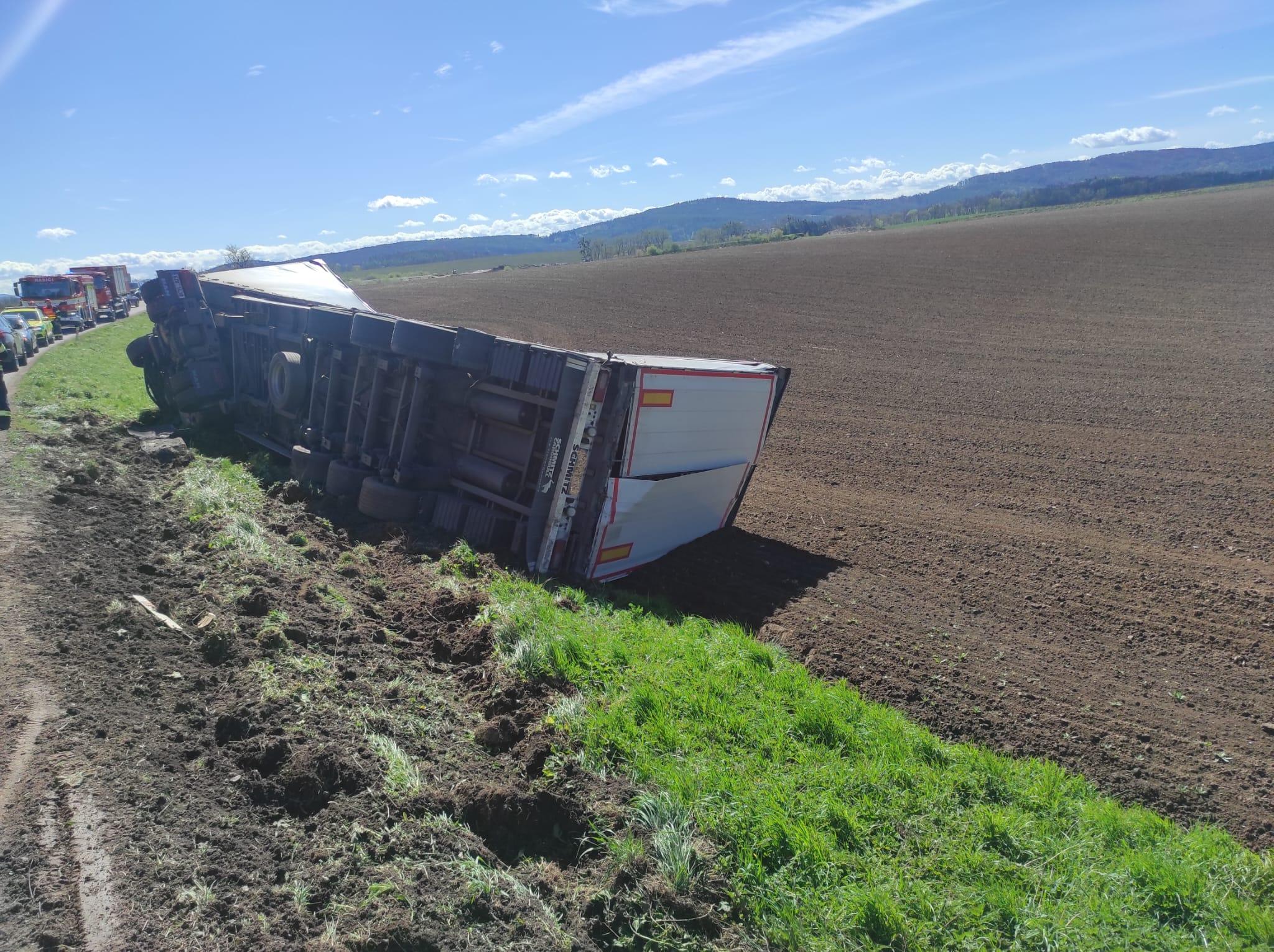 U Horního Lapače se převrátil kamion. Řidiči se naštěstí nic nestalo