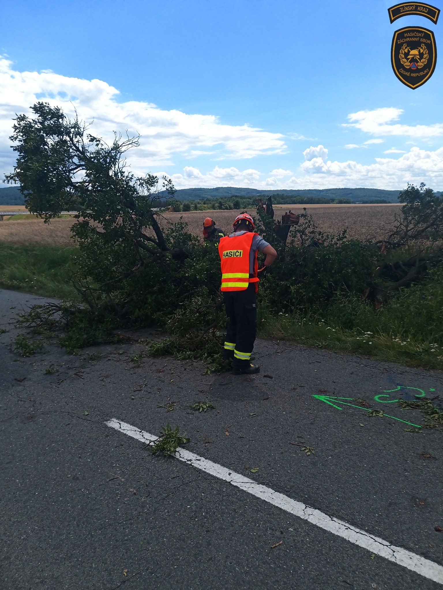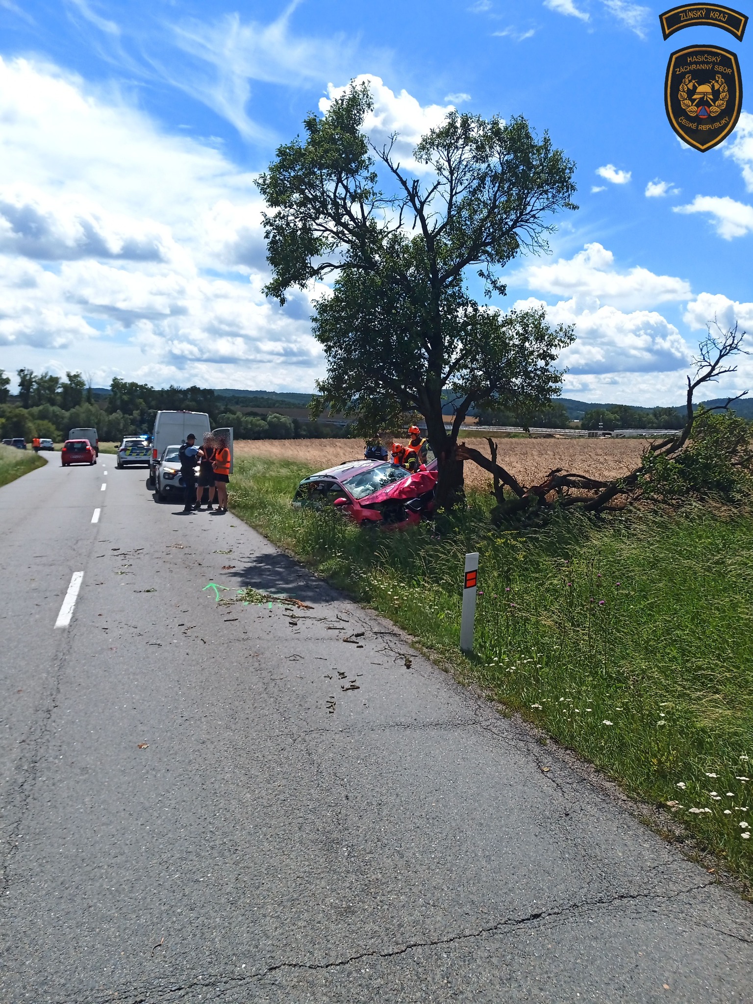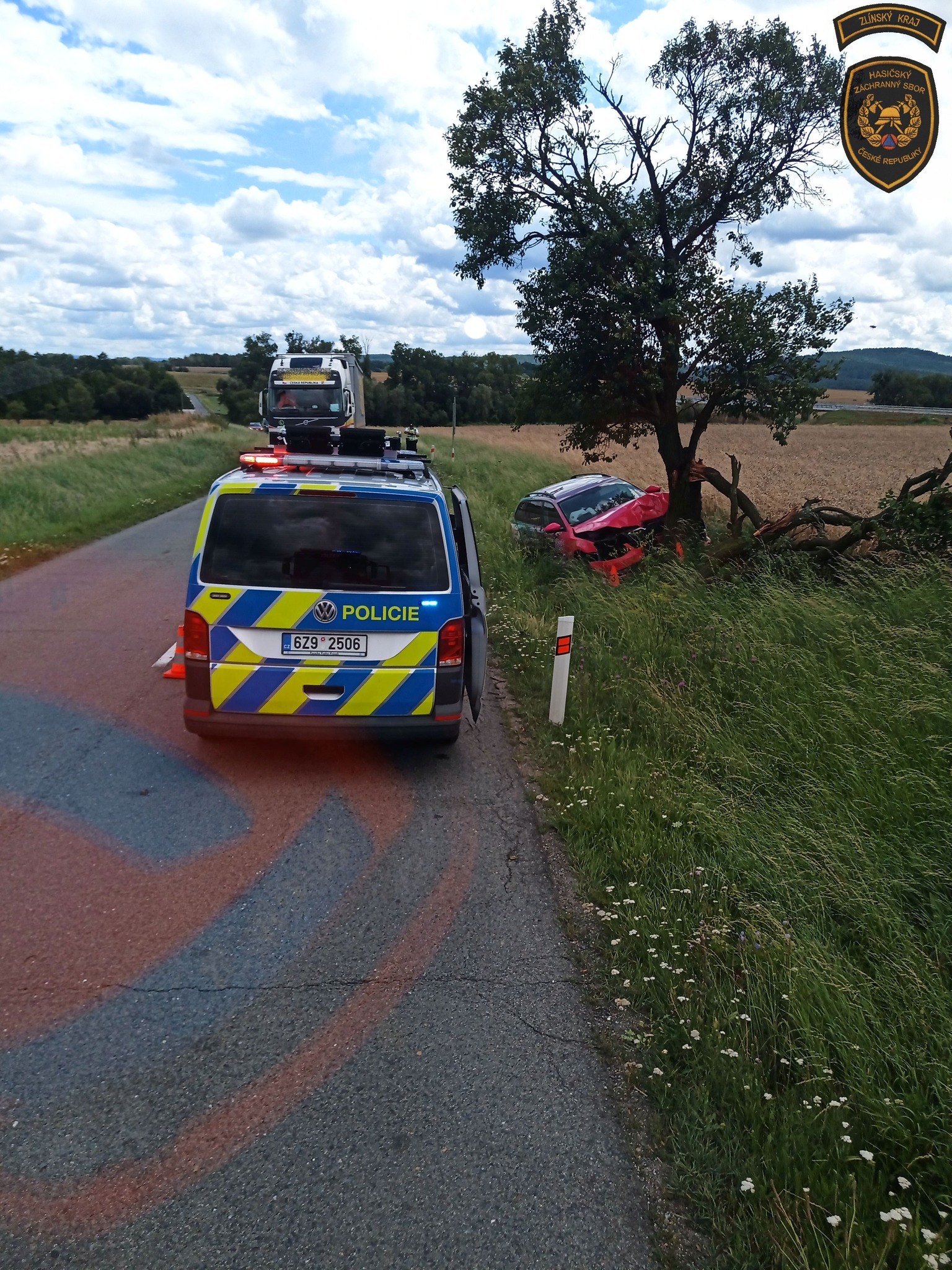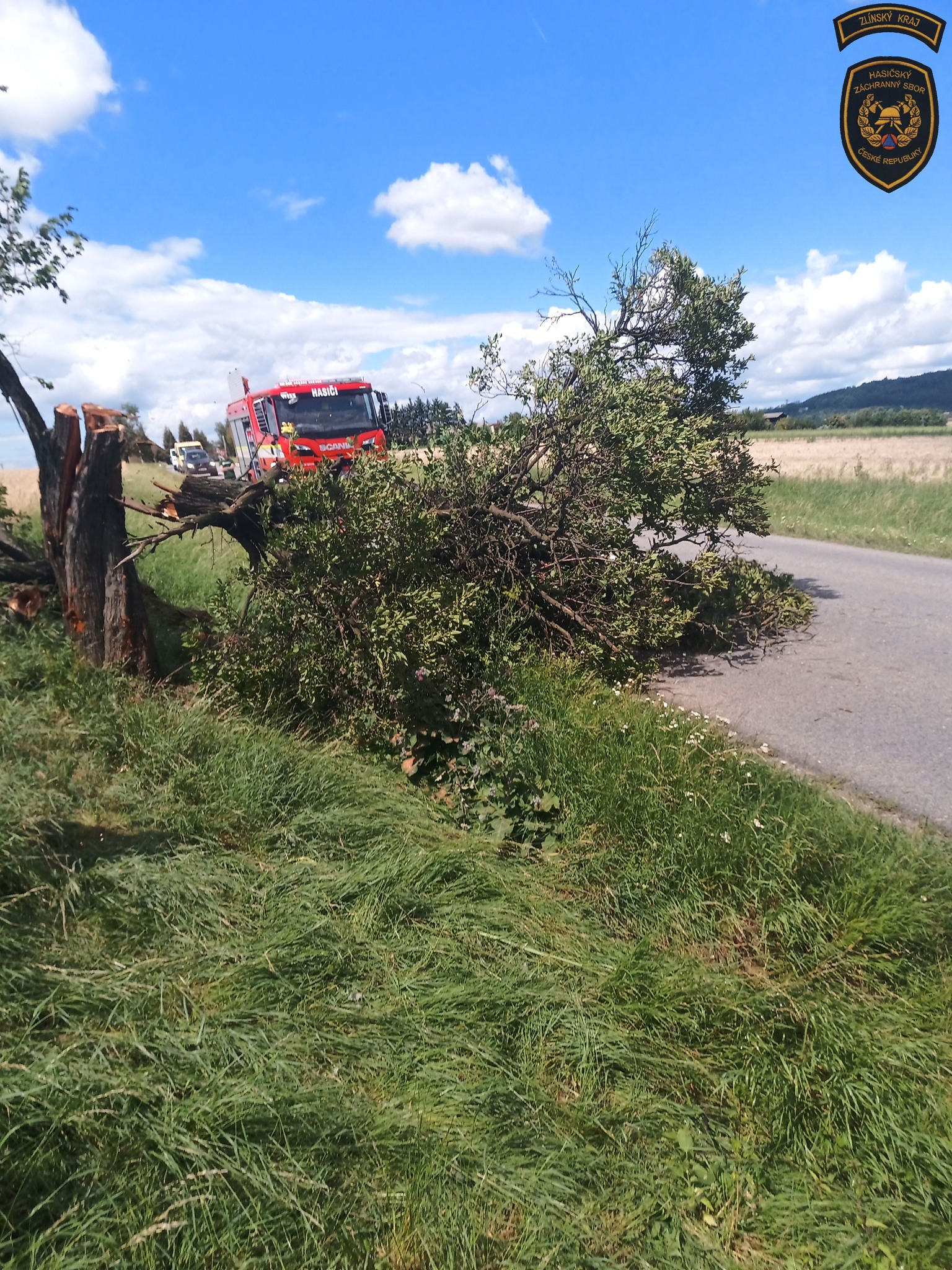Po prošetření nehody ze strany Policie ČR hasiči odstranili strom, který byl poškozený nárazem a hrozil pádem do vozovky.