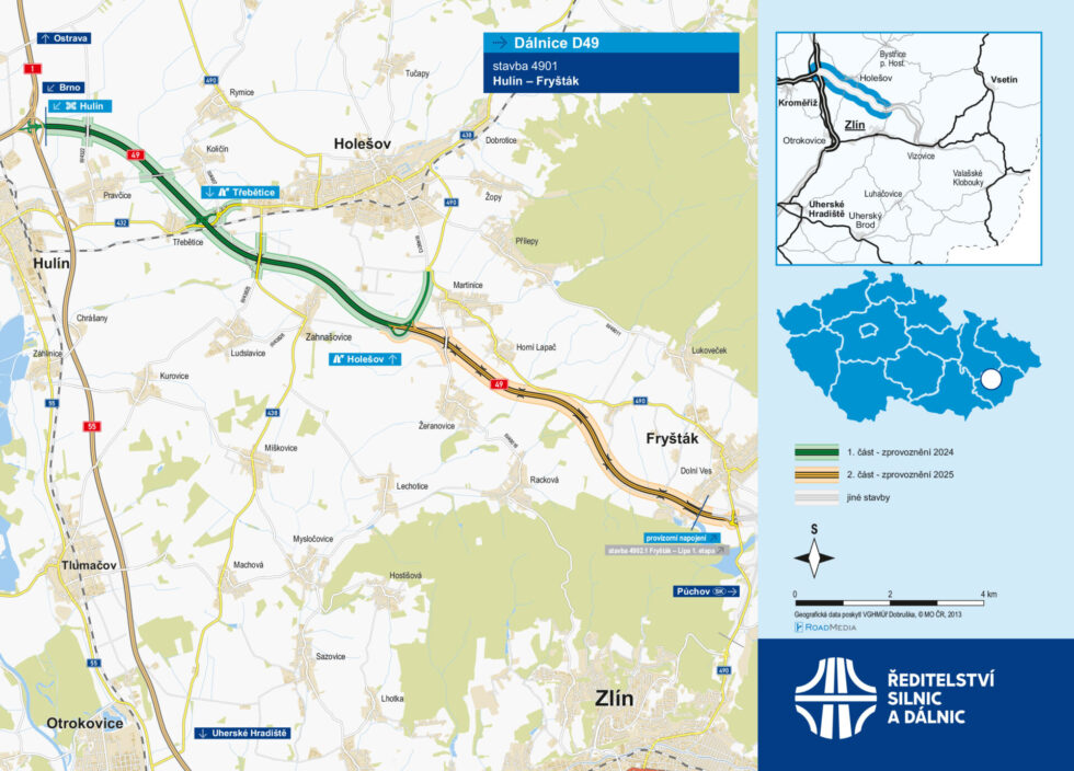 HulínJeště do konce roku 2024 se řidiči poprvé projedou po dálnici D49 mezi Hulínem a Holešovem, kde bude zprovozněn desetikilometrový úsek. Další část dálnice vedoucí do Fryštáku bude hotová v první polovině příštího roku.