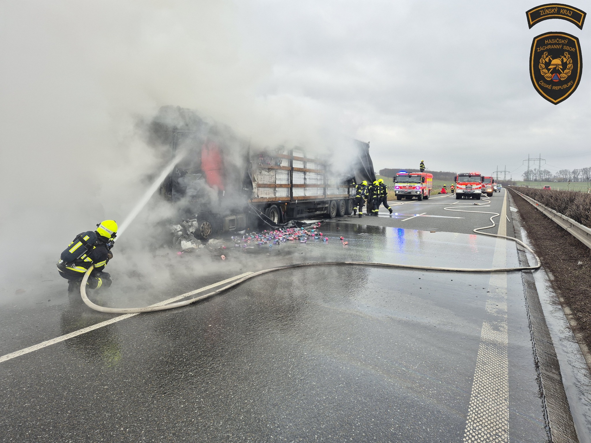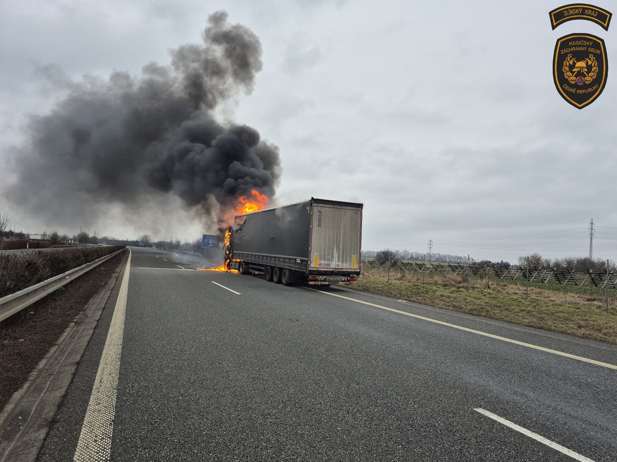 Dálnici D55 na 22. kilometru směrem z Otrokovic na Hulín krátce před druhou hodinou odpolední zablokoval hořící kamion, který převážel drogistické zboží. Na místo okamžitě vyjely profesionální jednotky hasičů z Kroměříže a Otrokovic.