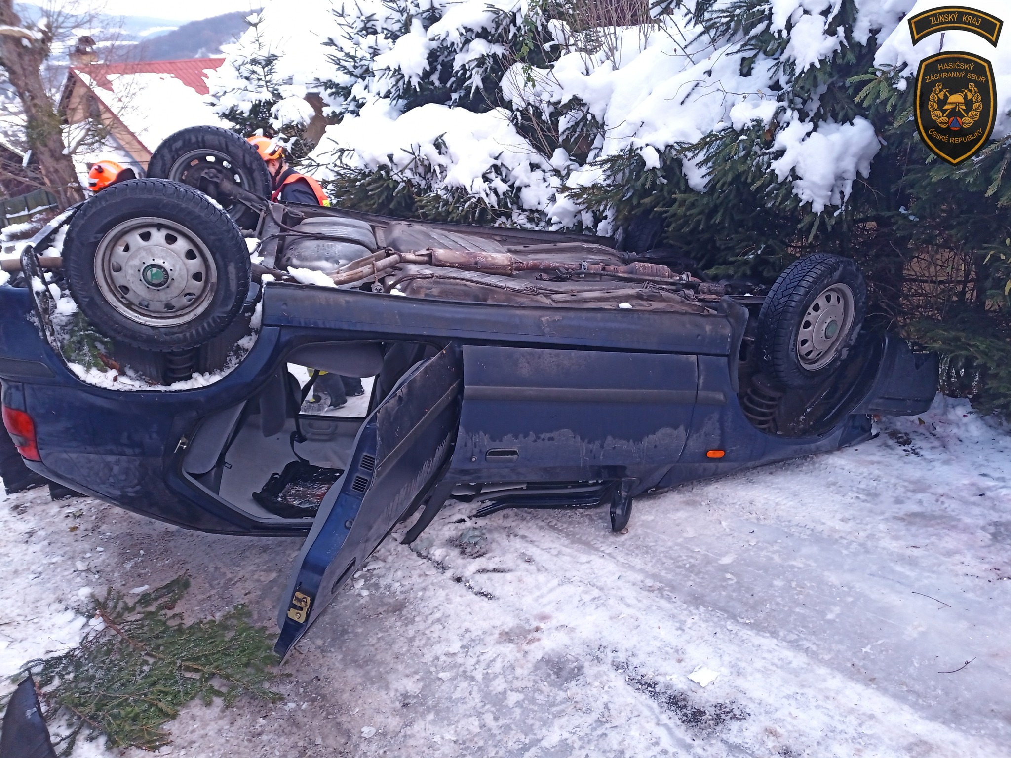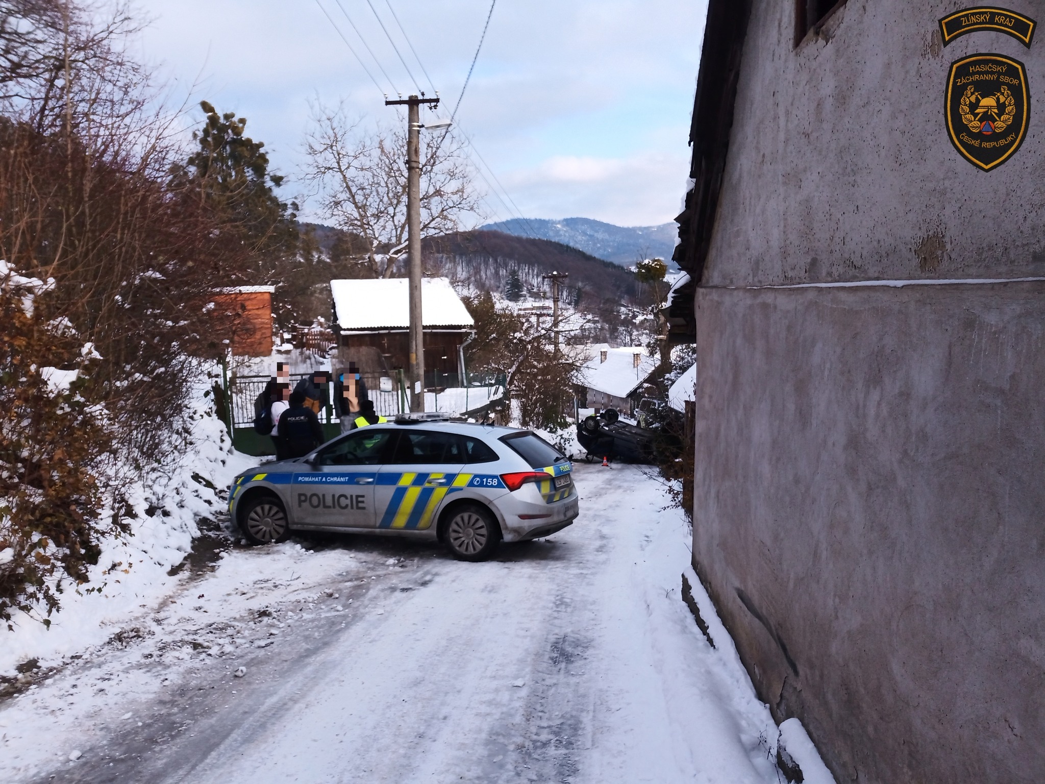 Nepříjemnou zkušenost mají za sebou čtyři mladíci, kteří v úterý dopoledne jeli v Kašavě na Zlínsku po místní zledovatělé komunikaci. Při jízdě z kopce skončili s vozidlem koly vzhůru.