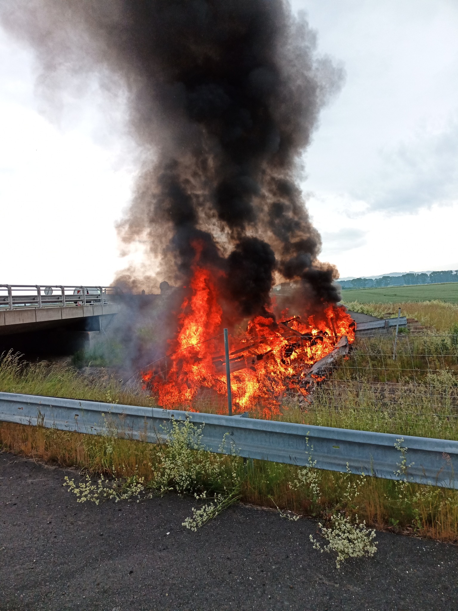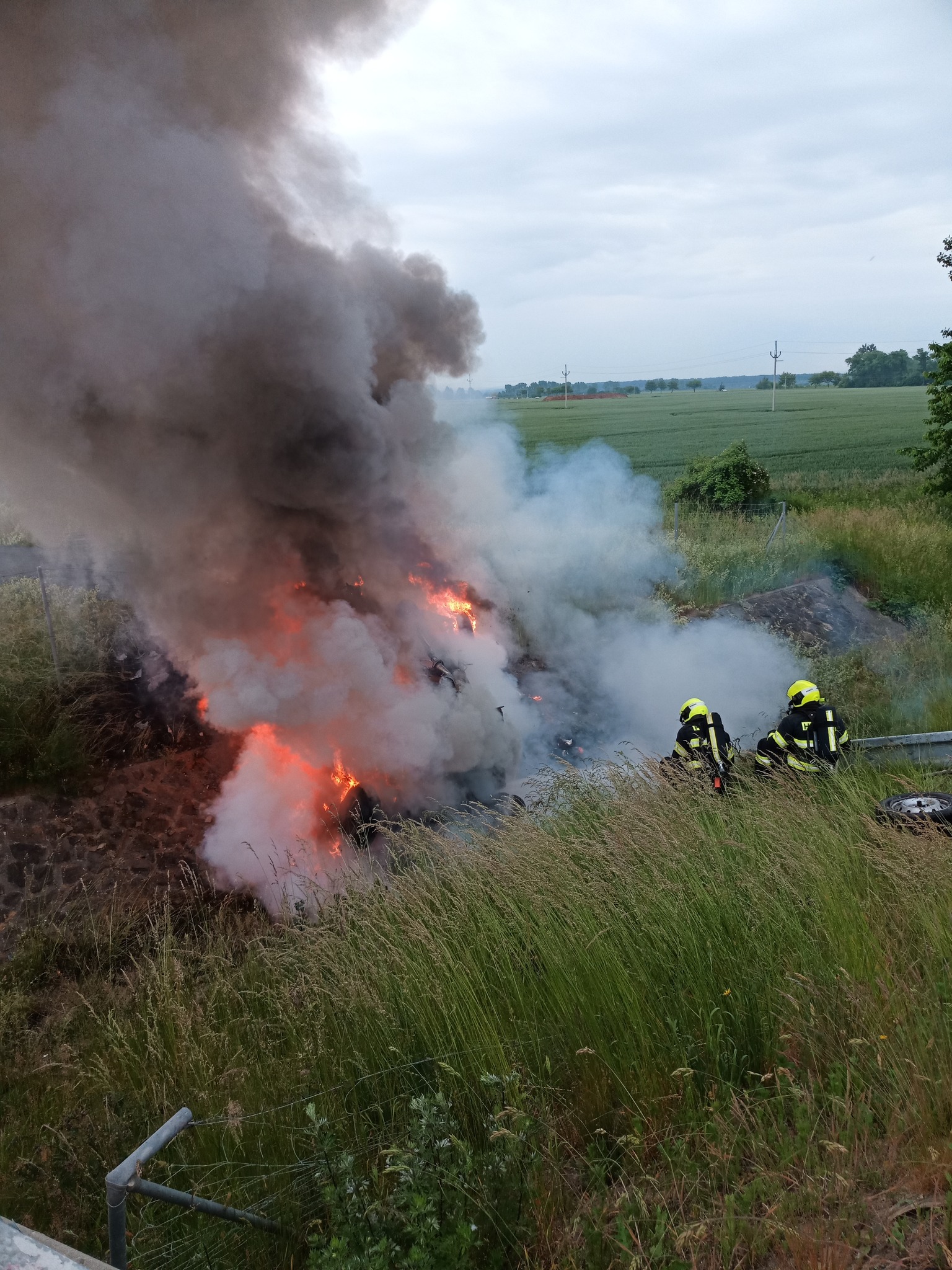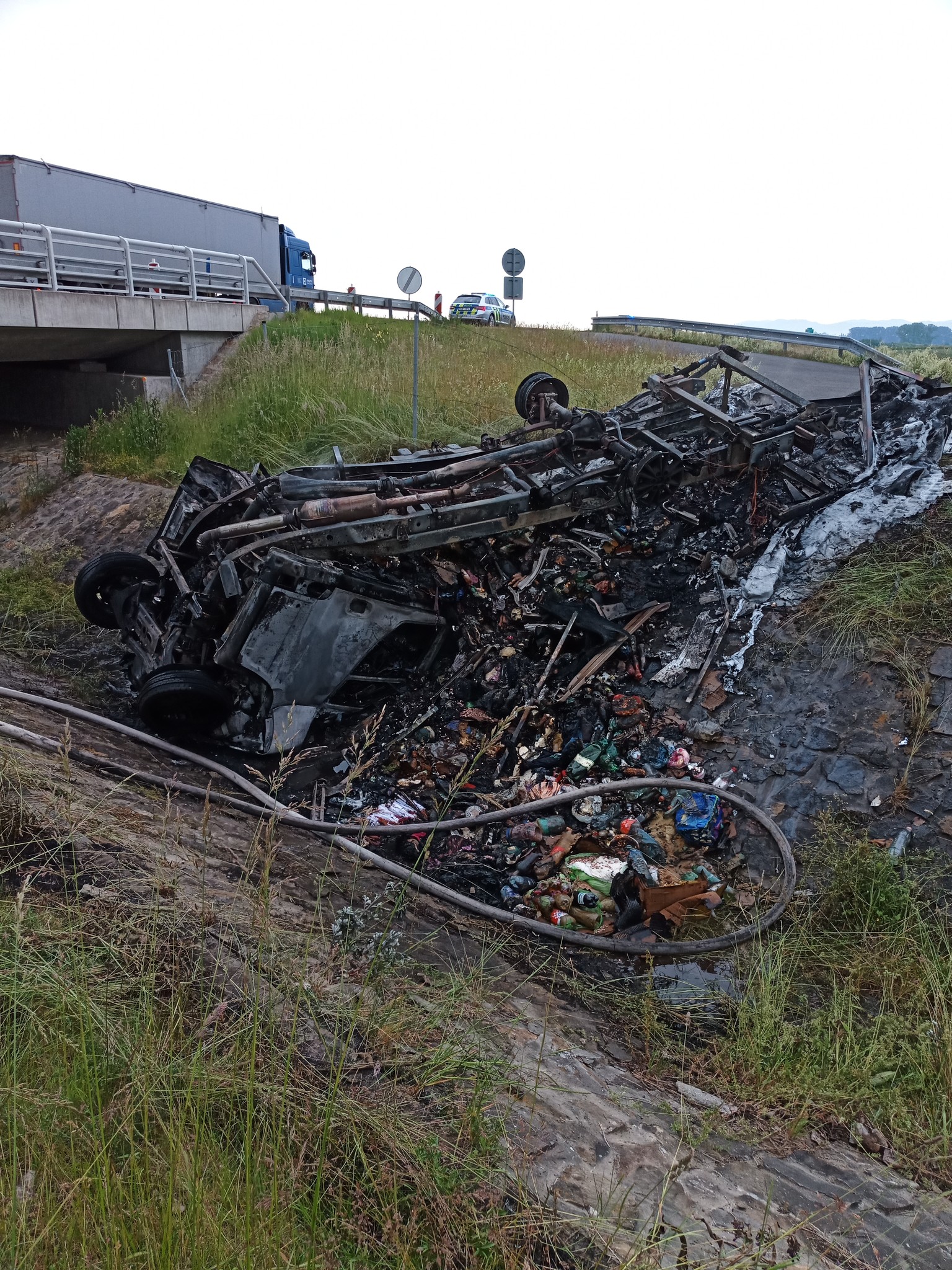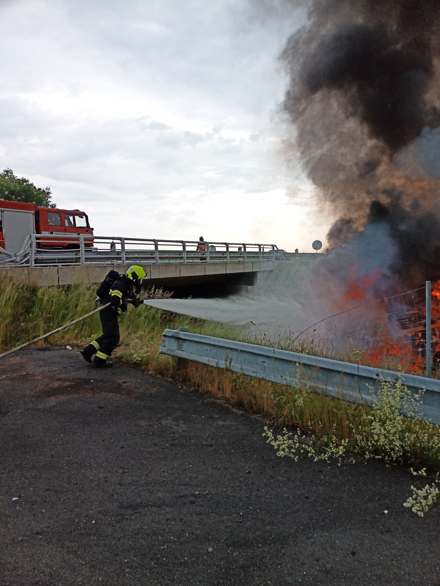 Na dálnici D1 u Kroměříže havarovalo nákladní vozidlo. Převrácené a v plamenech skončilo v korytě potoka
