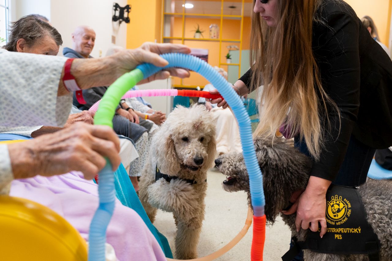 Skupinovou canisterapii absolvovali pacienti ve společenské místnosti oddělení, kde proběhly různé aktivity. „Trénovali jsme jemnou a hrubou motoriku rukou, pacienti pejsky česali, aby si zkusili, co obnáší péče o srst pudla. Je totiž opravdu náročná,“ popsala Pavla Šmídová s tím, že program a aktivity jsou pokaždé jiné a mění se dle aktuální situace nebo ročního období.