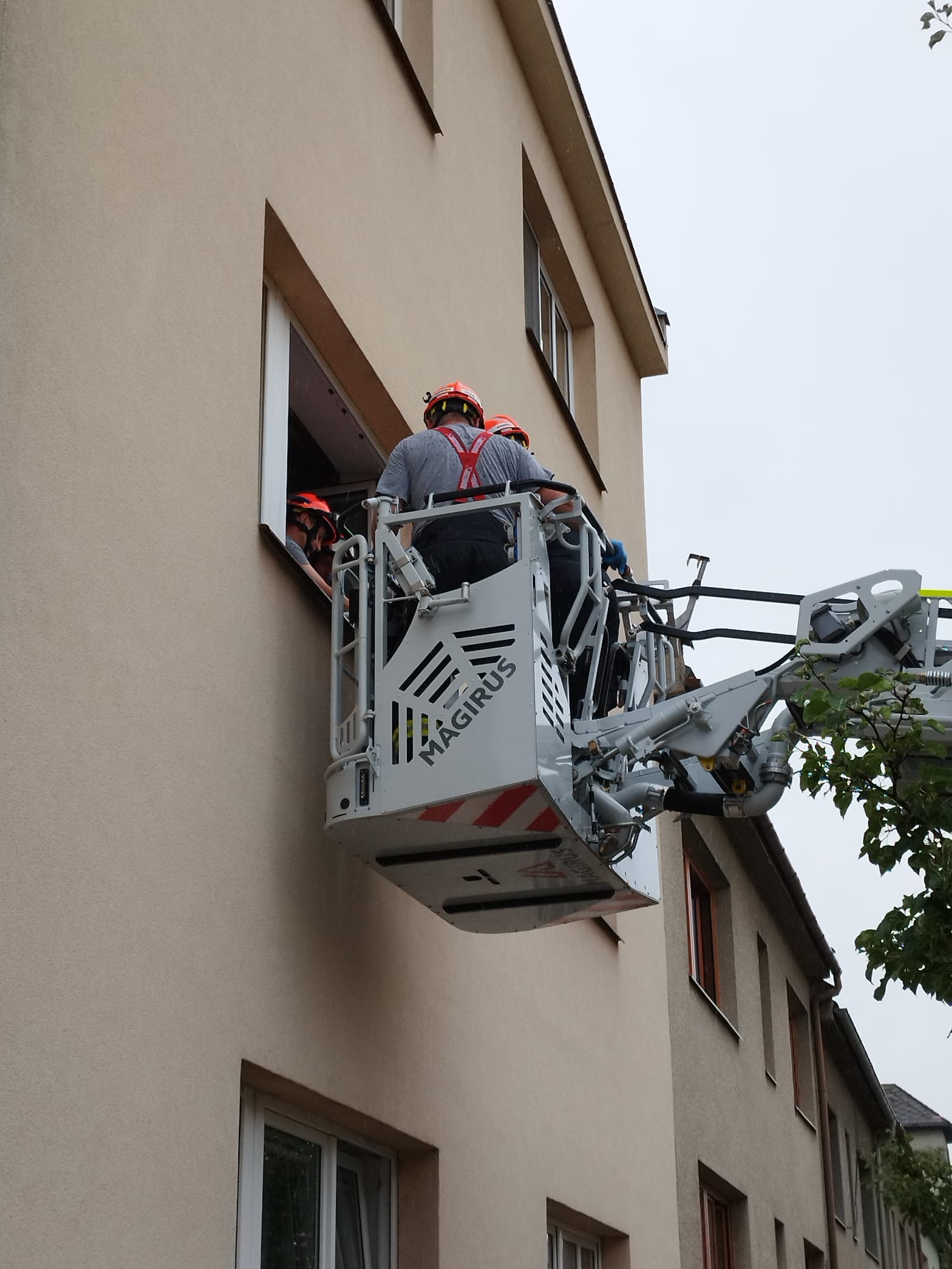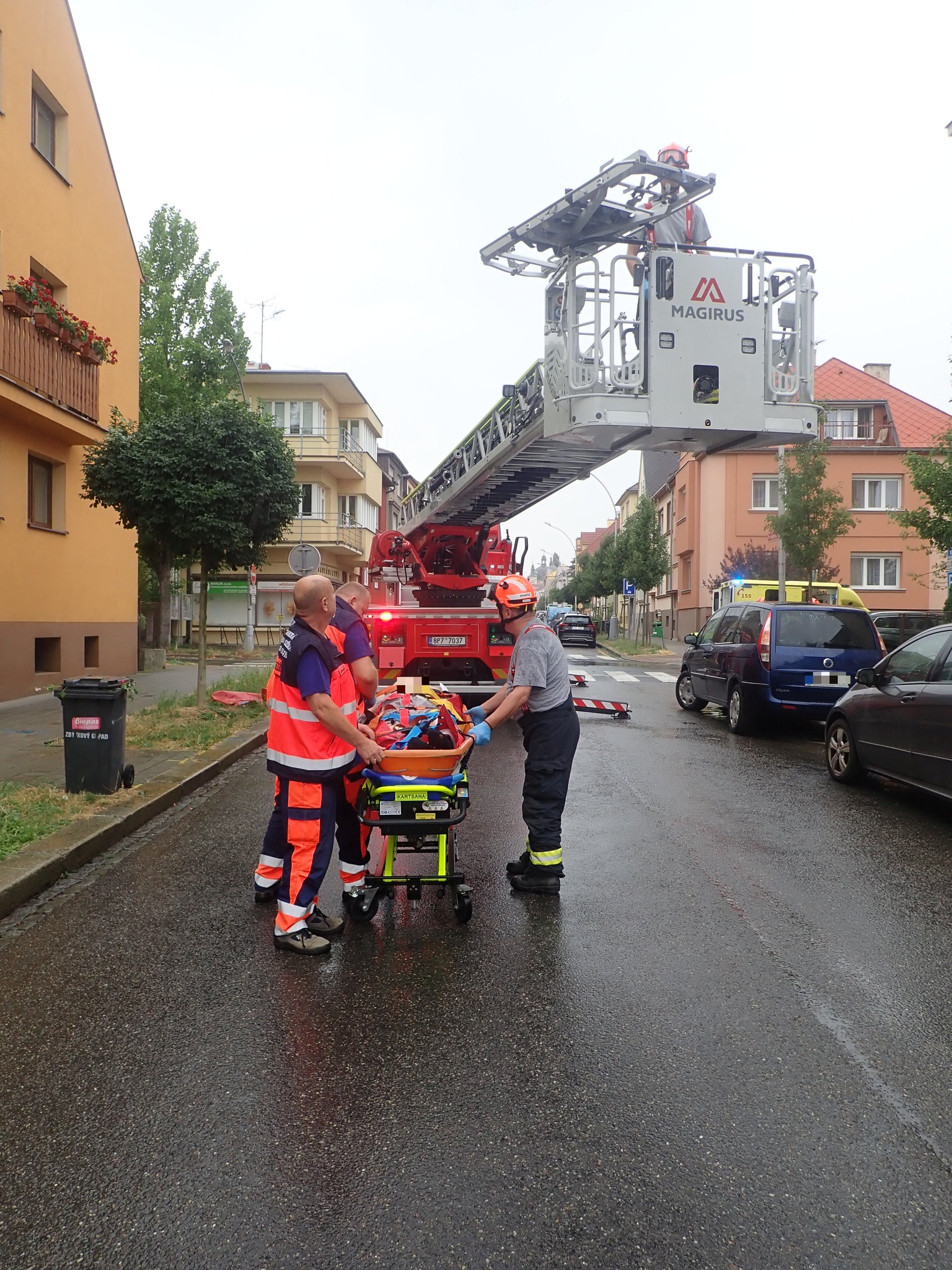 KroměřížPomoc profesionálních hasičů si ve čtvrtek 13. července dopoledne vyžádal transport zraněného seniora do nemocnice. Špatný přístup do bytu znemožňoval snesení pacienta klasickým způsobem, a tak musela být použita výšková hasičská technika.