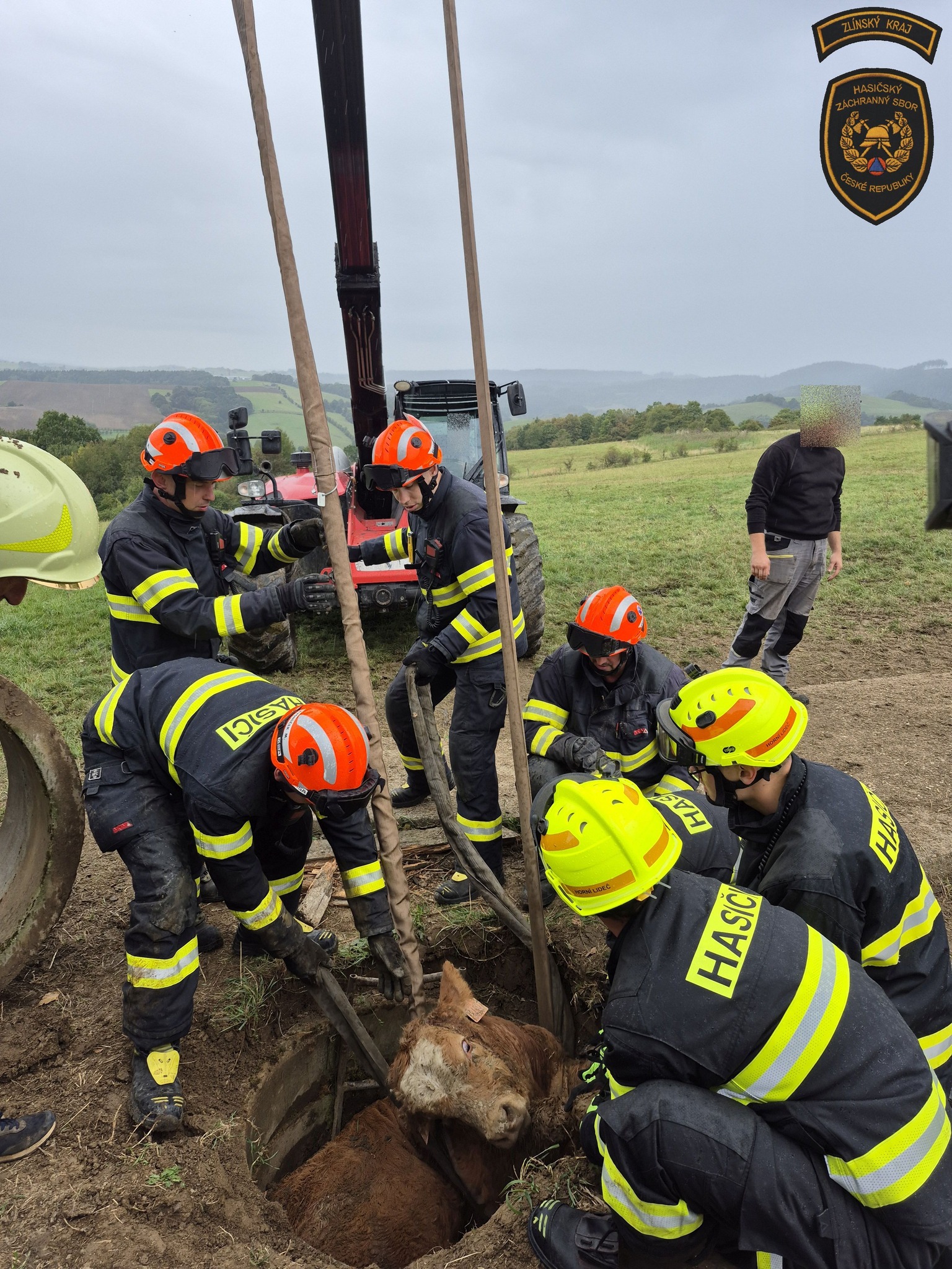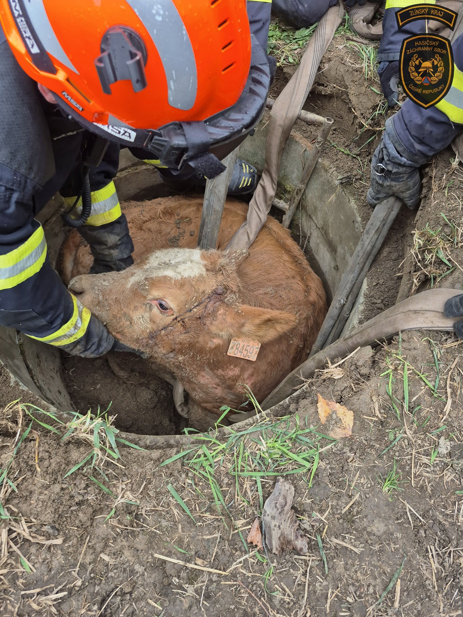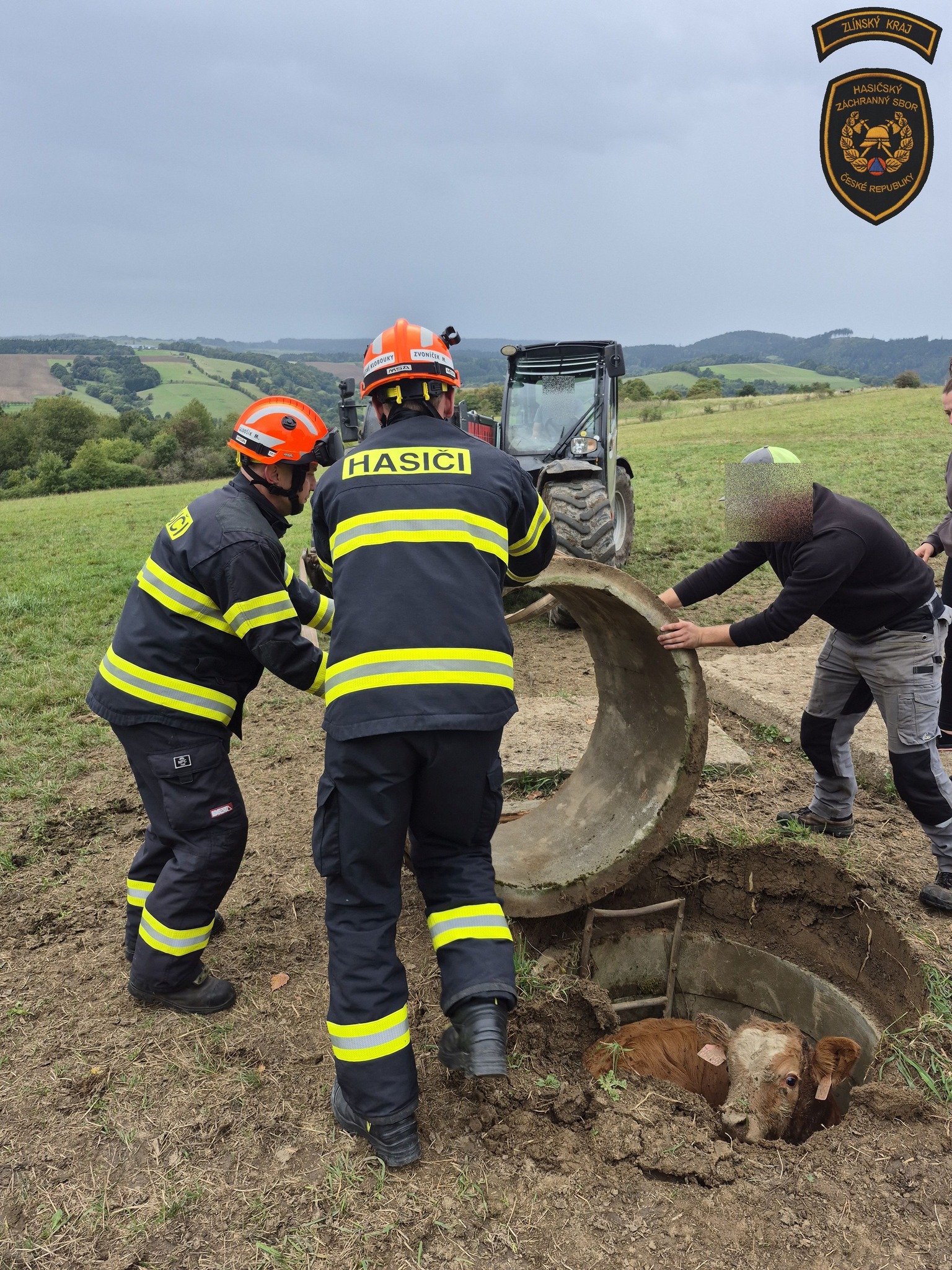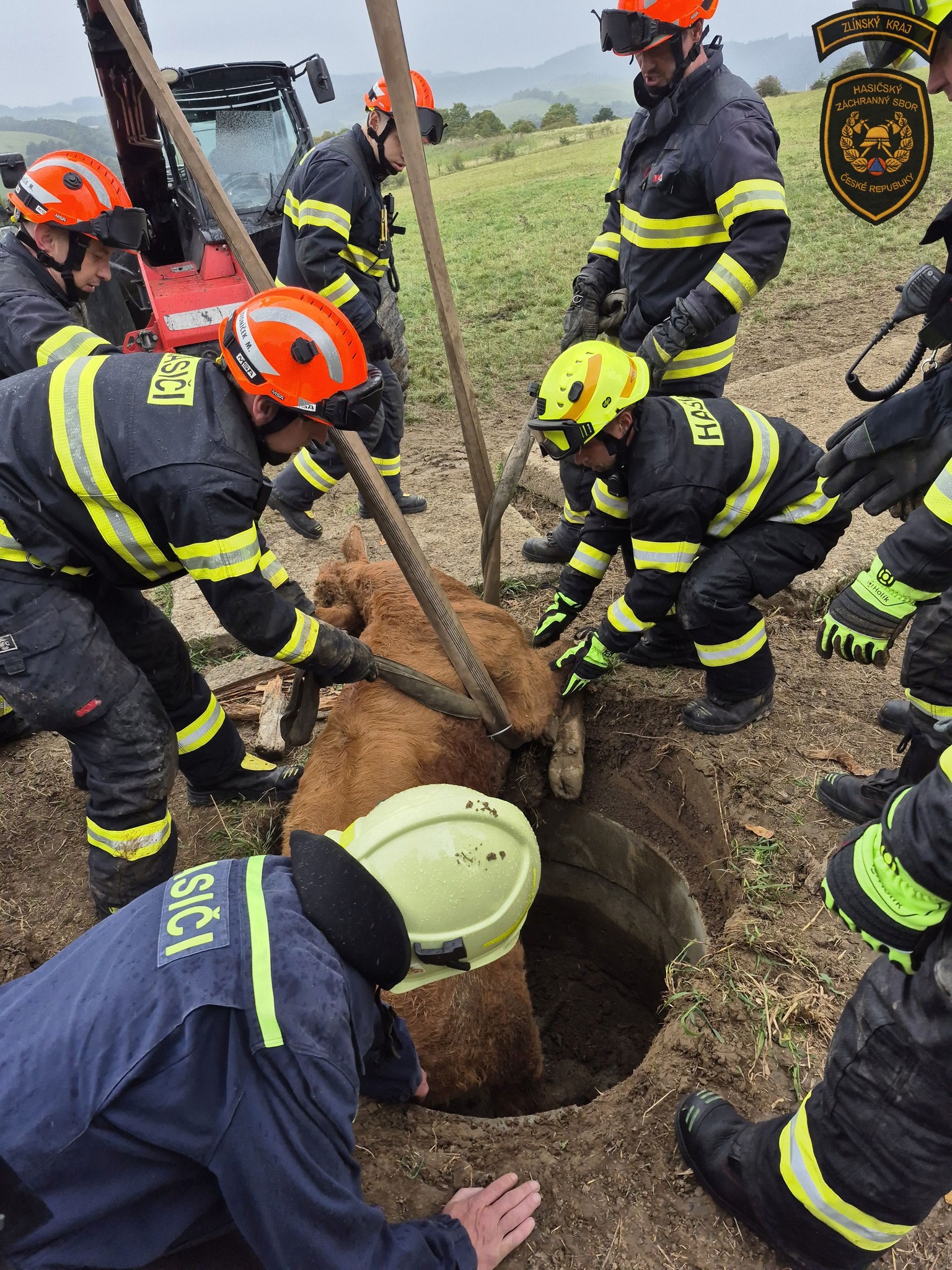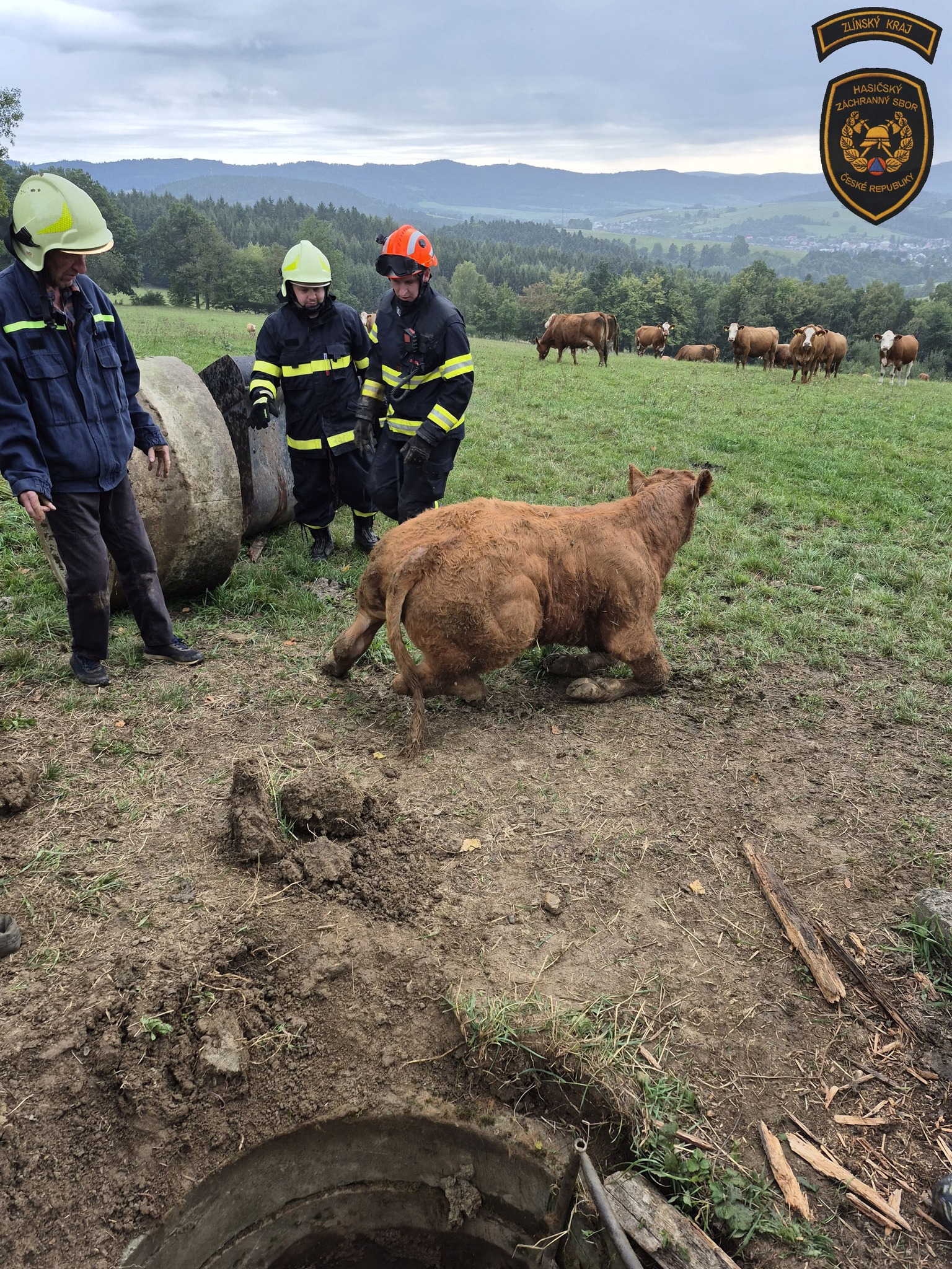 Na Vsetínsku spadl býk do skruže. Zachránili ho hasiči