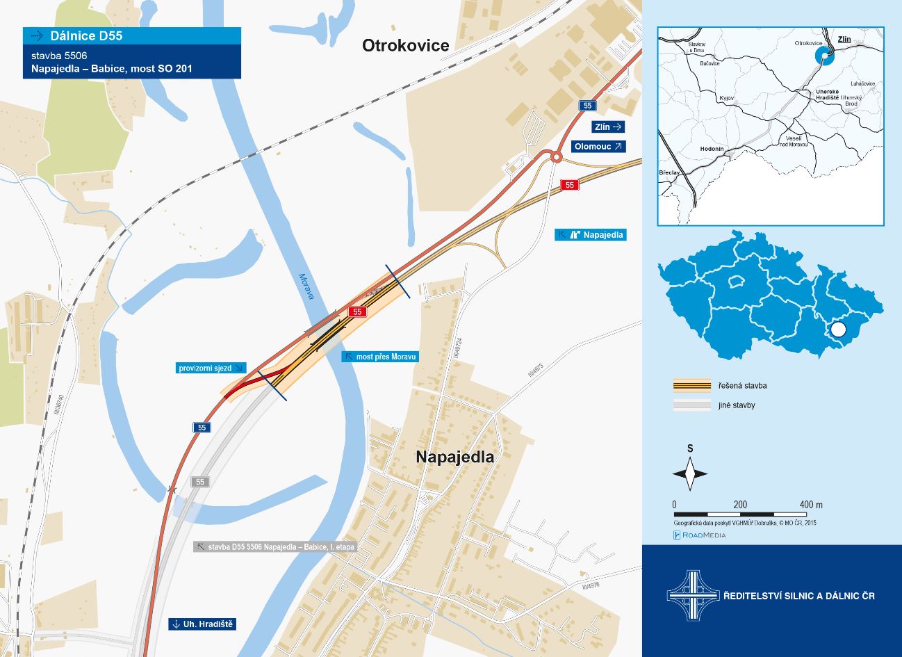 Stavba D55 Napajedla - Babice je rozdělena do tří etap. První, která řeší napojení dálnice D55 na silnici I/55, již probíhá. Stavba mostu přes řeku Moravu je druhou etapou.