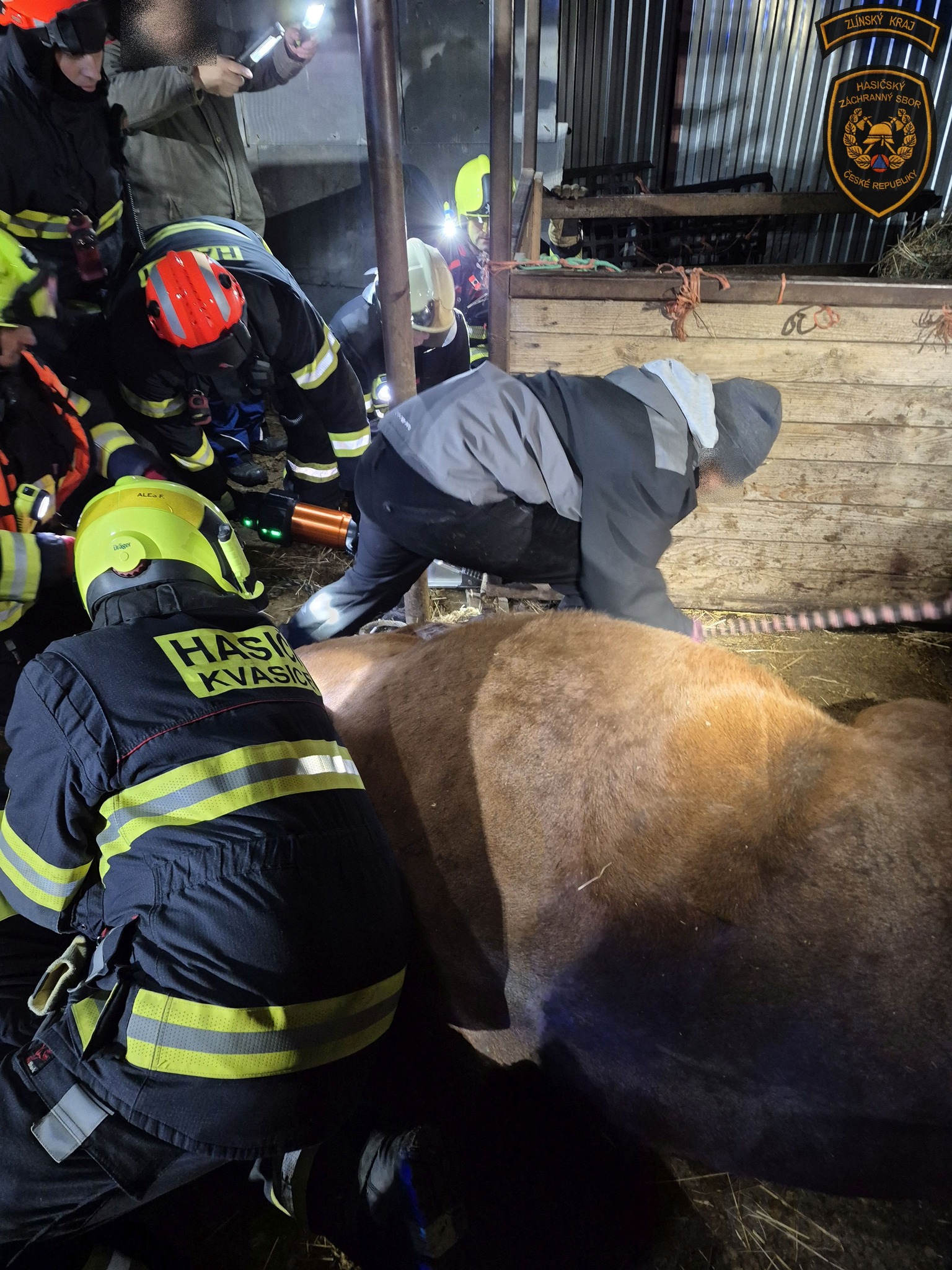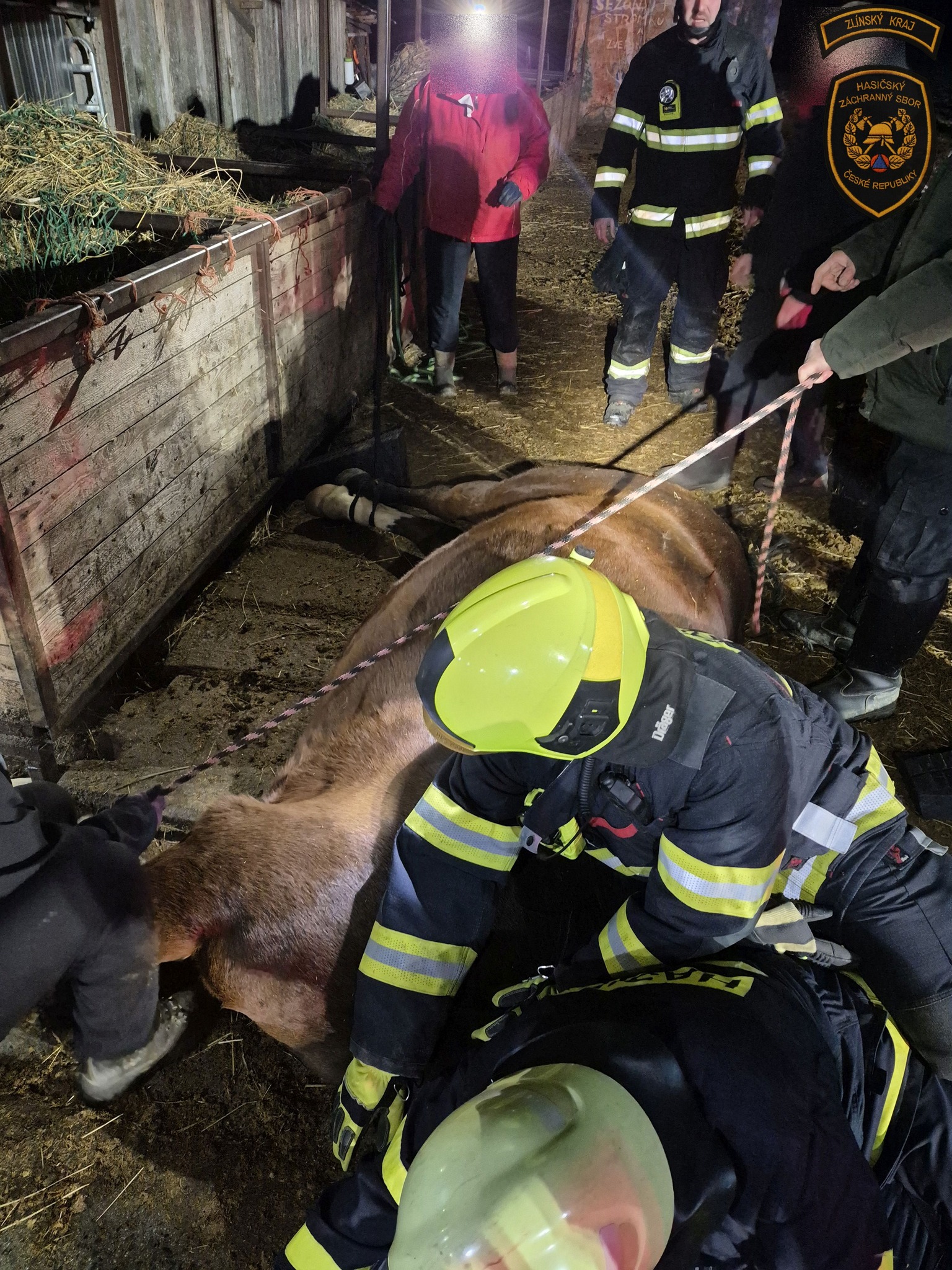 Kůň uklouzl a zůstal zaklíněný pod krmelcem. Vysvobodili ho hasiči se speciální technikou