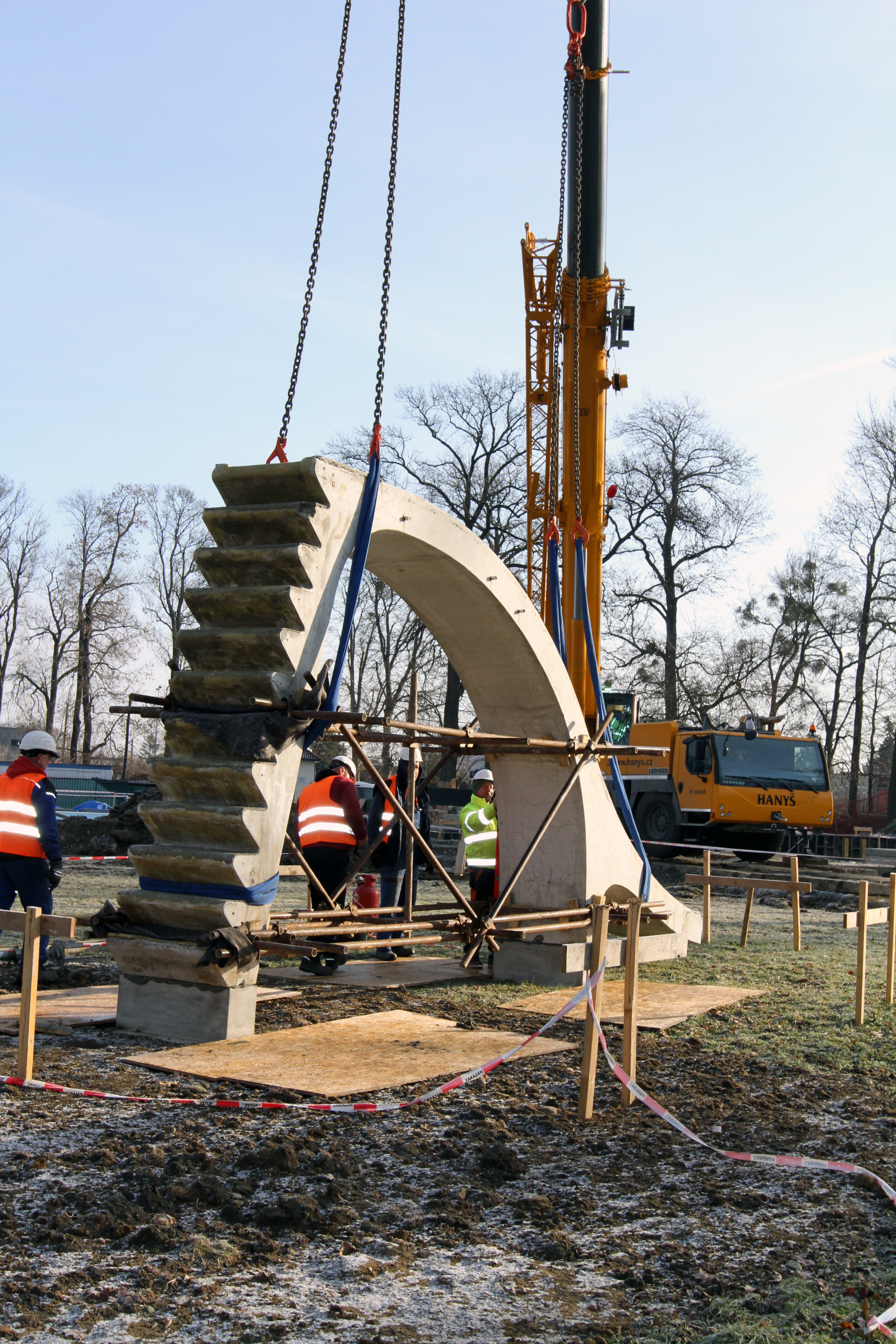 Od časného rána probíhaly přípravné práce pro přemístění skluzavky. Jakmile na místo dorazil těžkotonážní jeřáb, pracovníci přesně věděli, jaké kroky budou následovat. Připevnit, zajistit, zvednout, přemístit a položit.