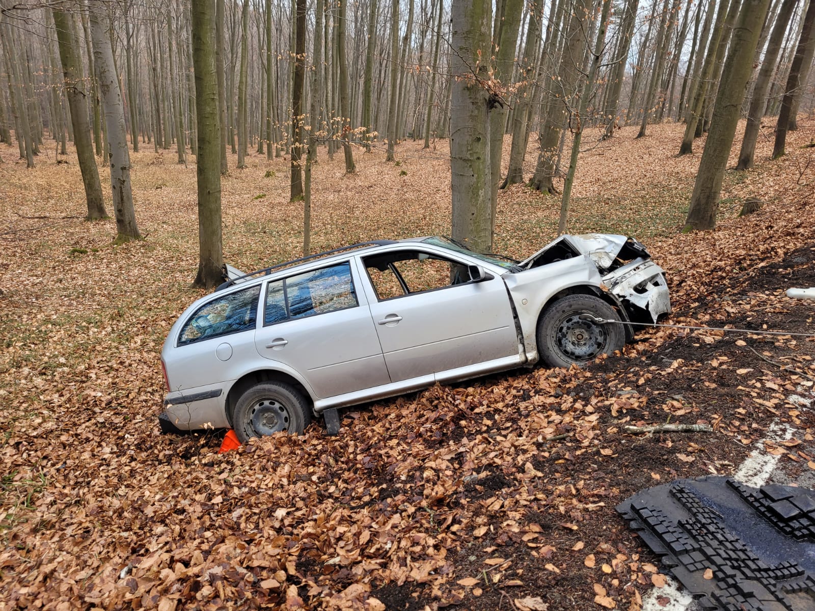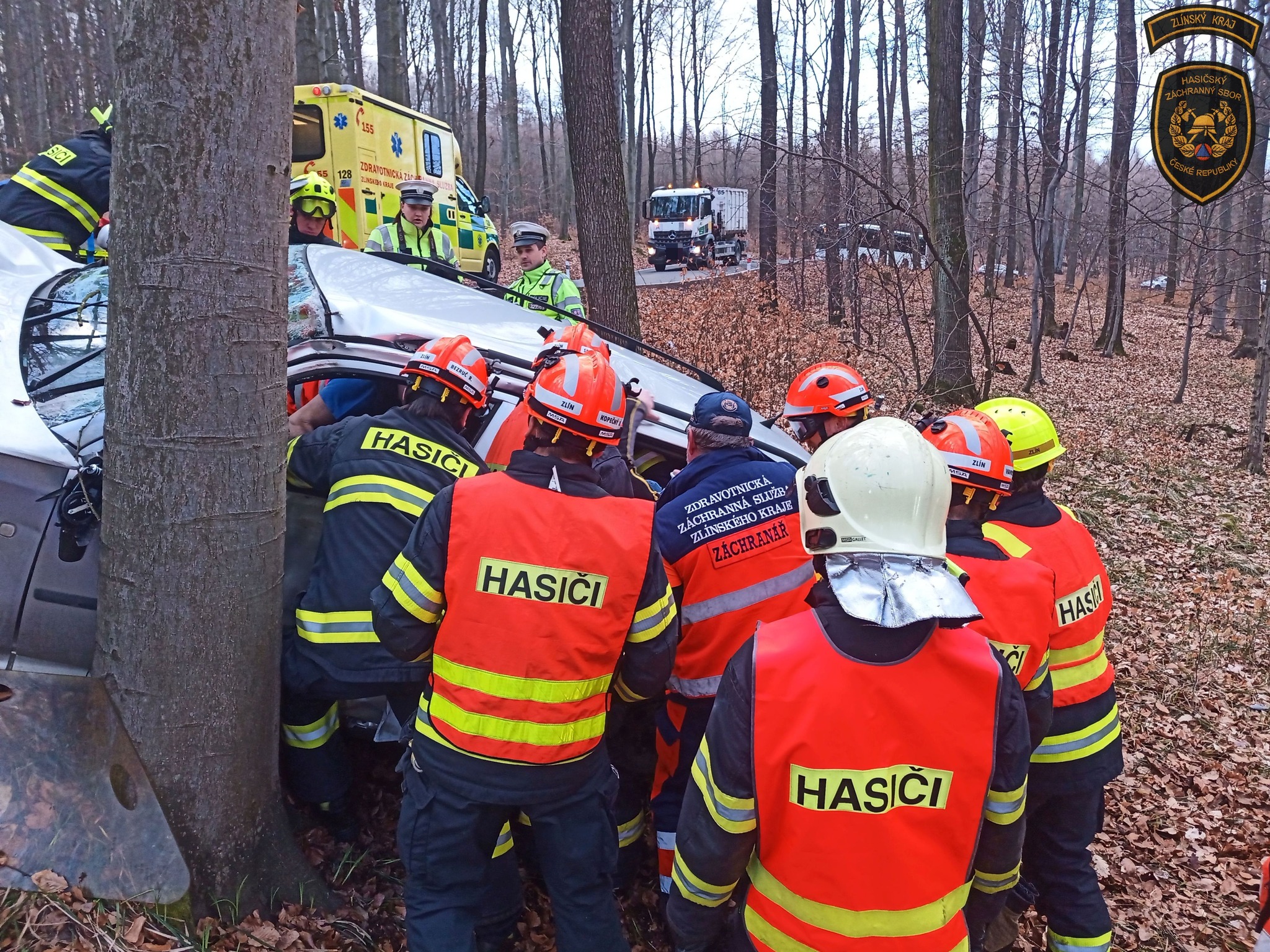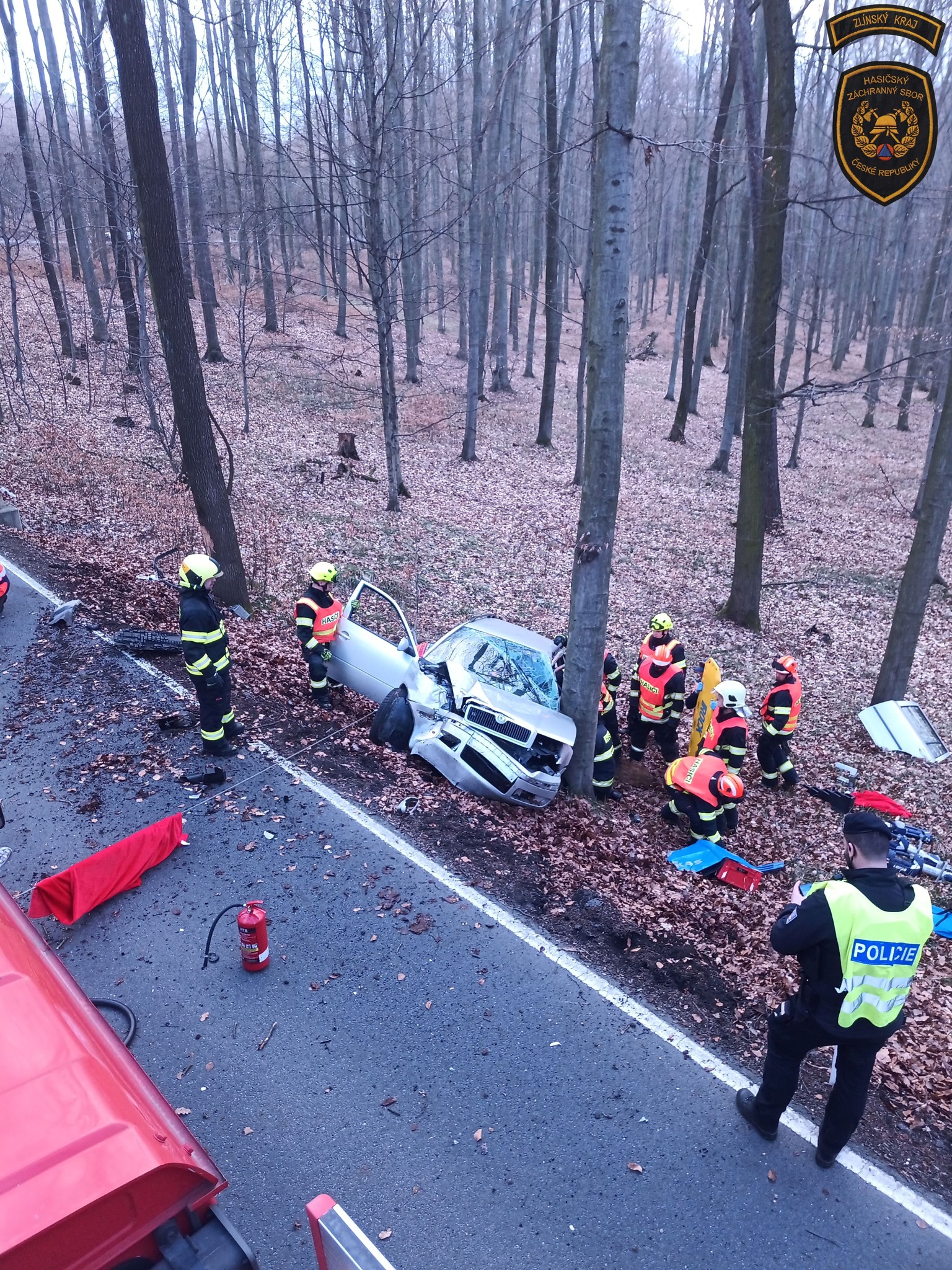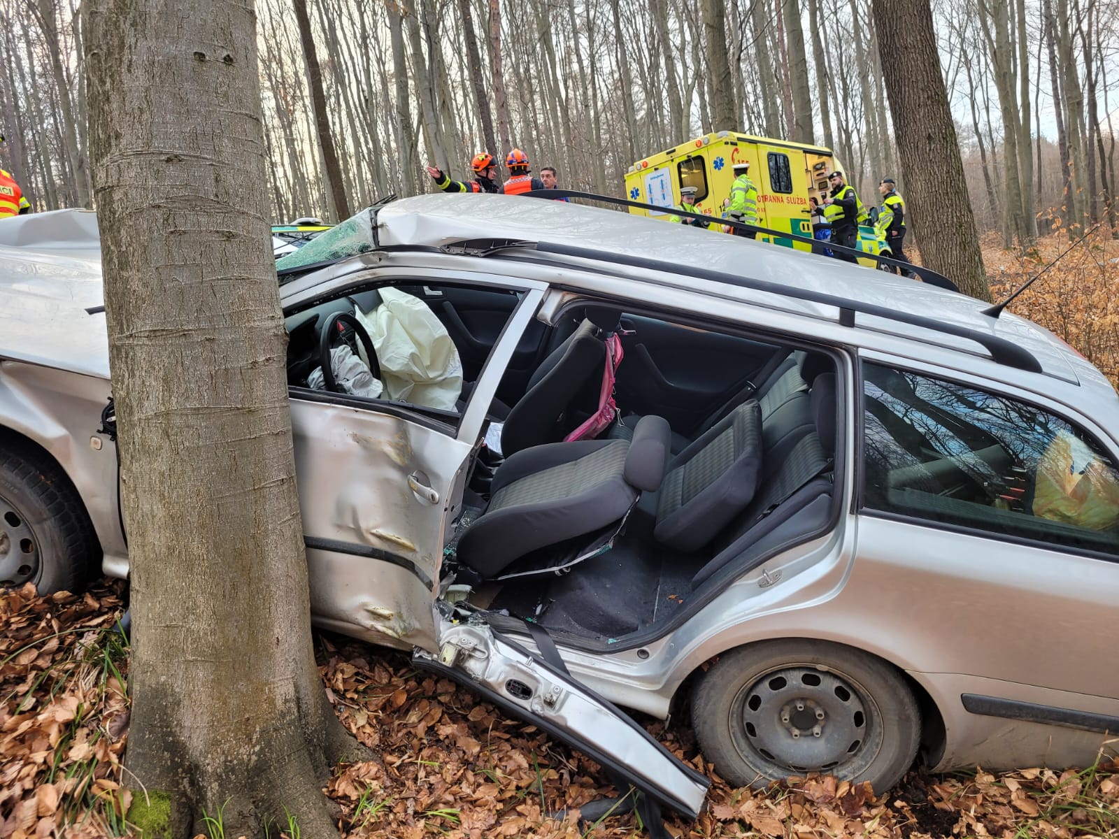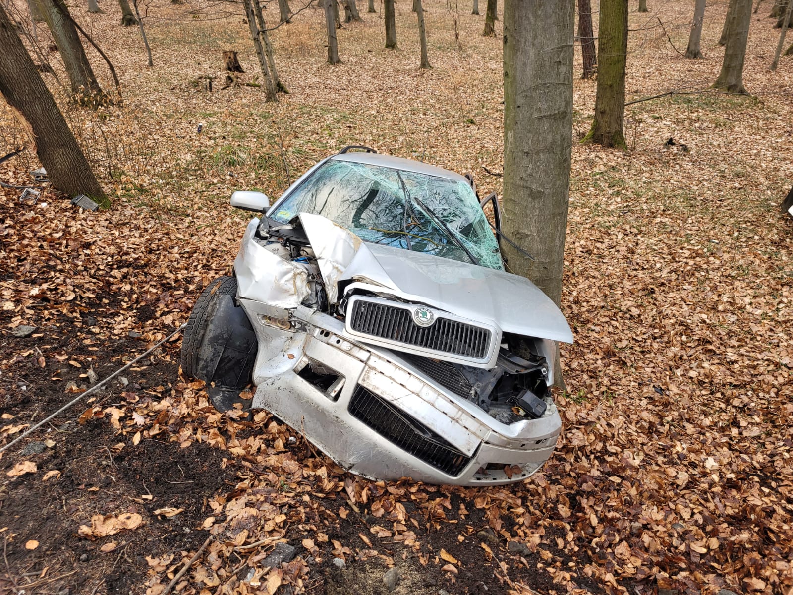 V lese nedaleko Zlína havaroval osobní automobil. Po nárazu do stromu zůstal řidič ve voze zaklíněný