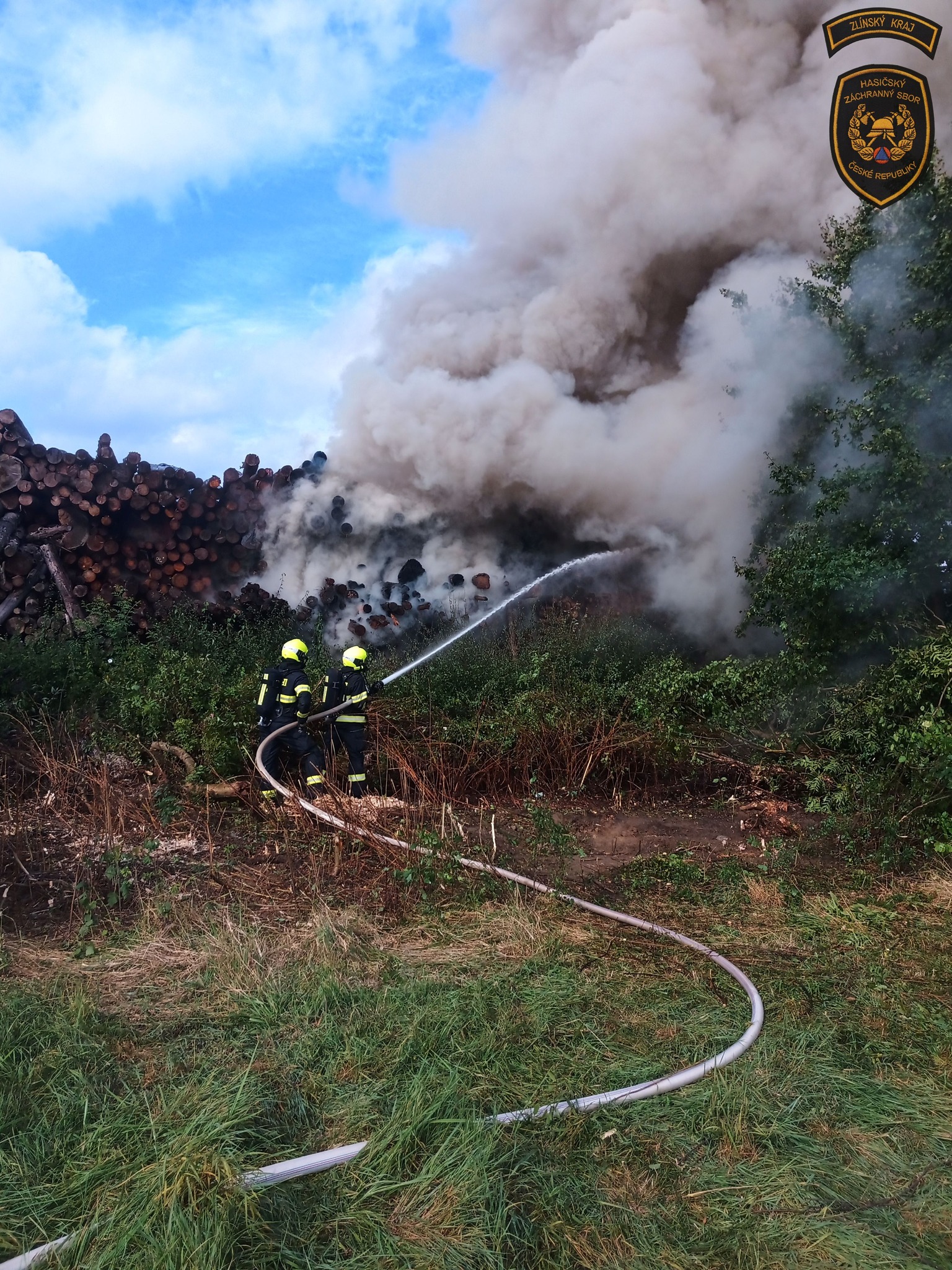 Devět jednotek hasičů bojovalo s rozsáhlým požárem dřeva a štěpky ve Slušovicích