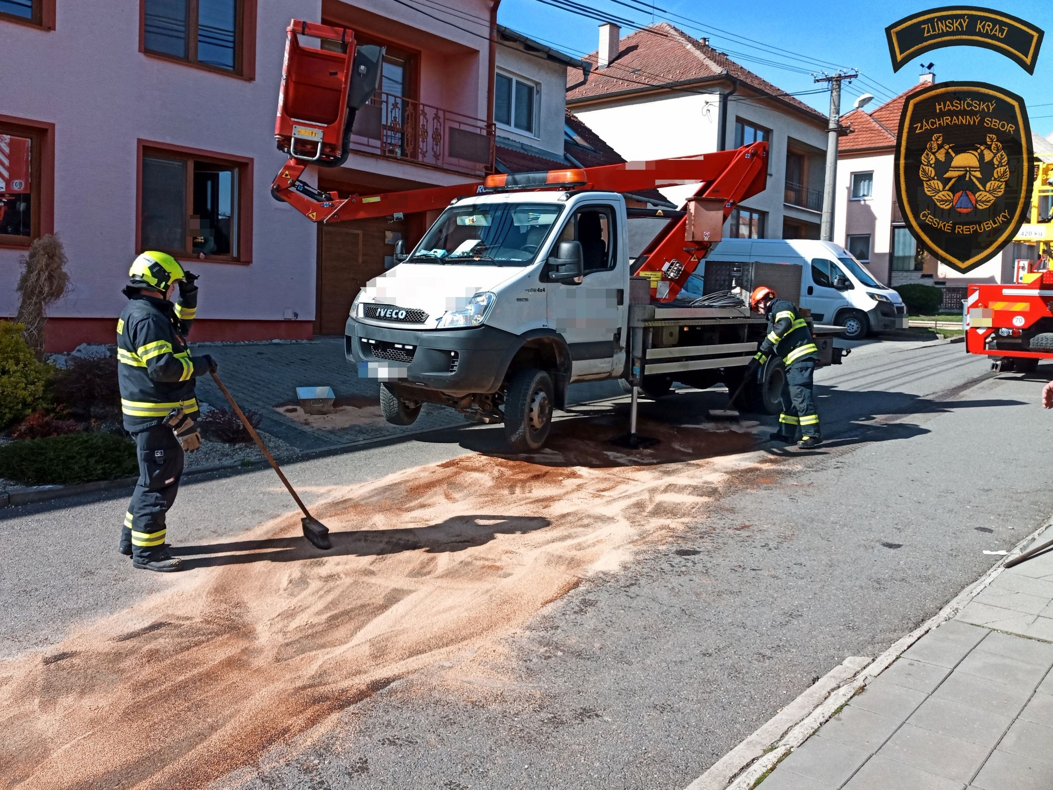 Hasiči následně zachytili uniklé kapaliny a zasypali je sorbentem. Celá událost se obešla bez zranění,“ dodali na závěr hasiči.