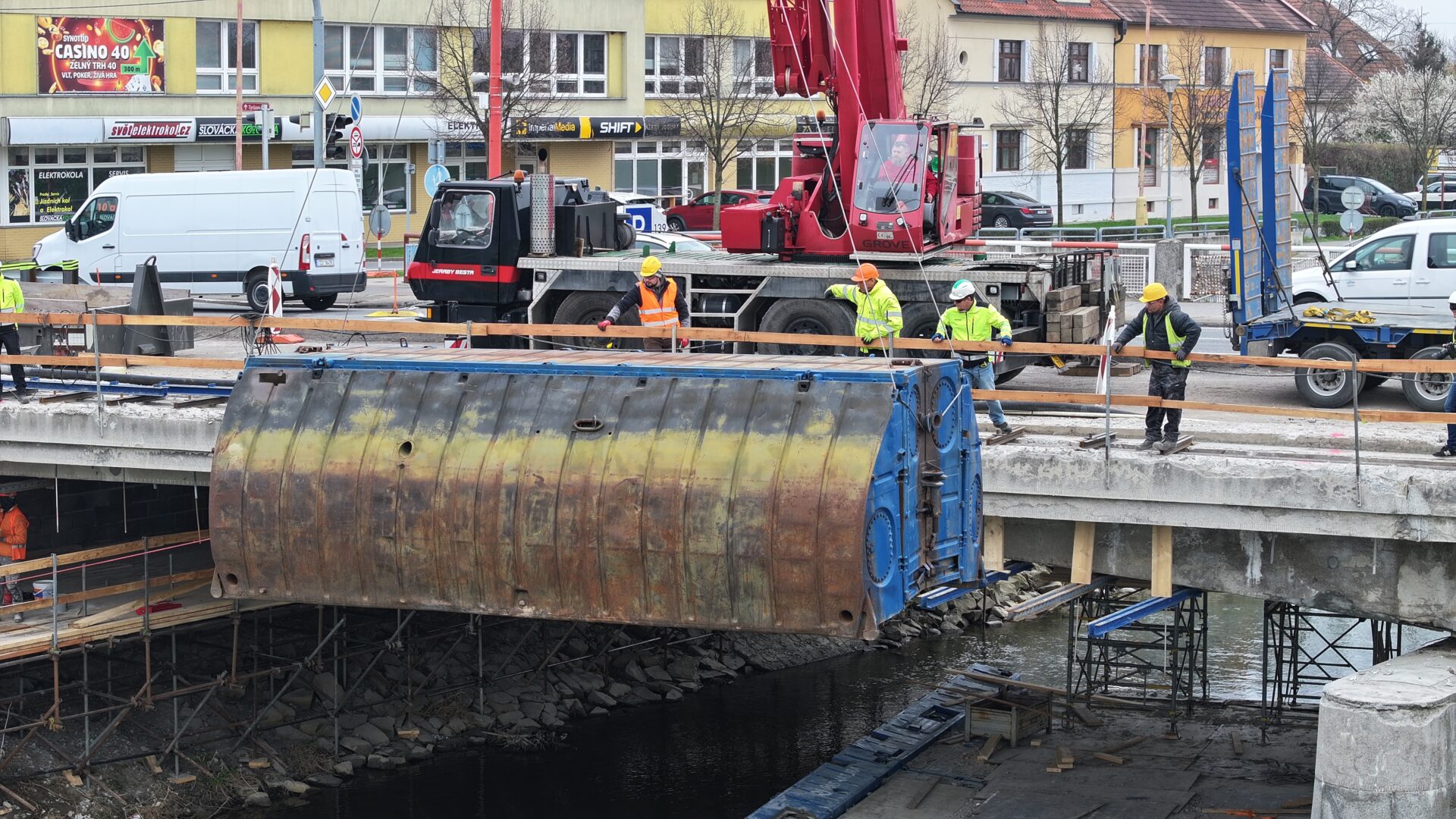 Aktuálně je na mostě umístěn jeřáb, který pontony o rozměrech 6 x 8 metrů snáší na řeku. Stavbaři je budou využívat až do začátku června.