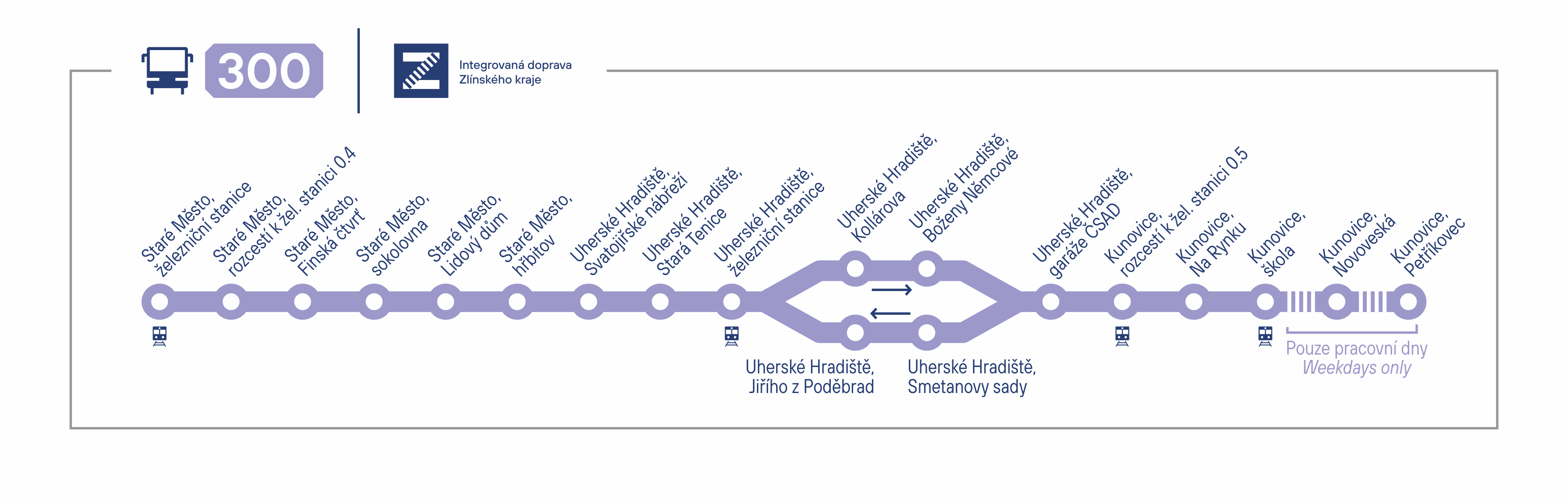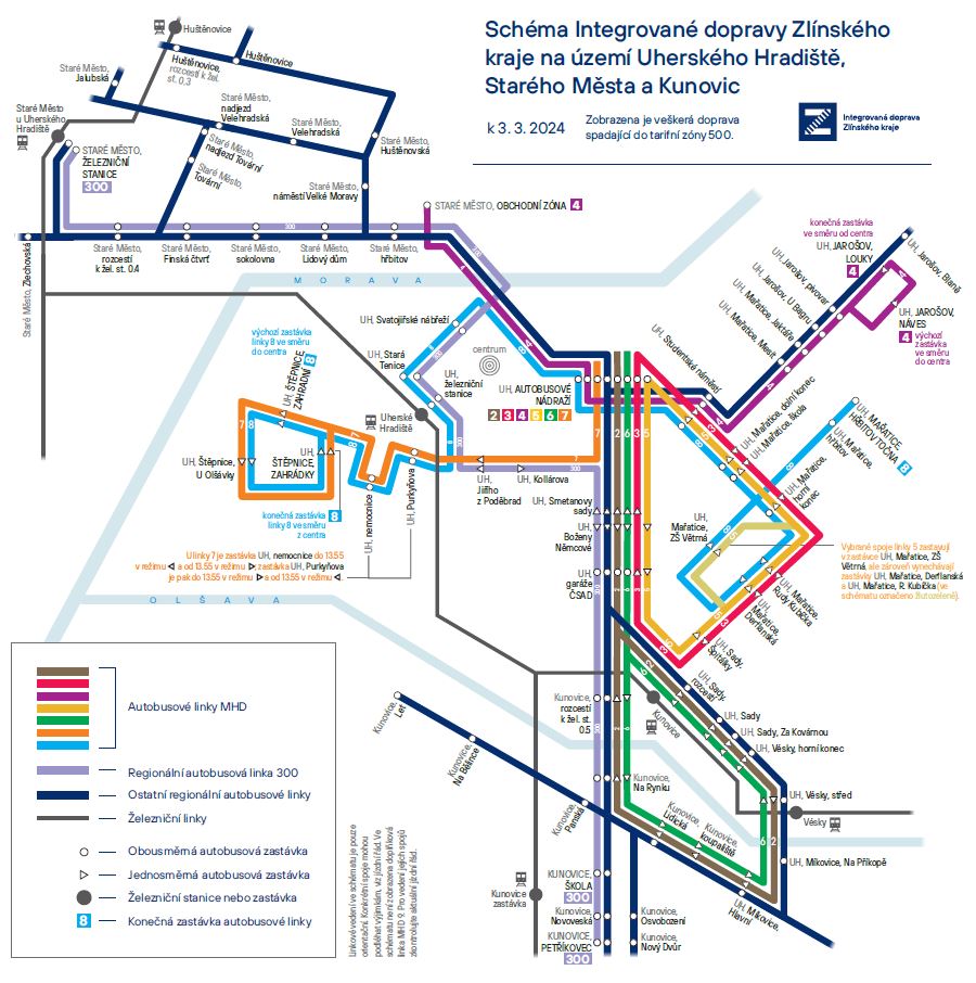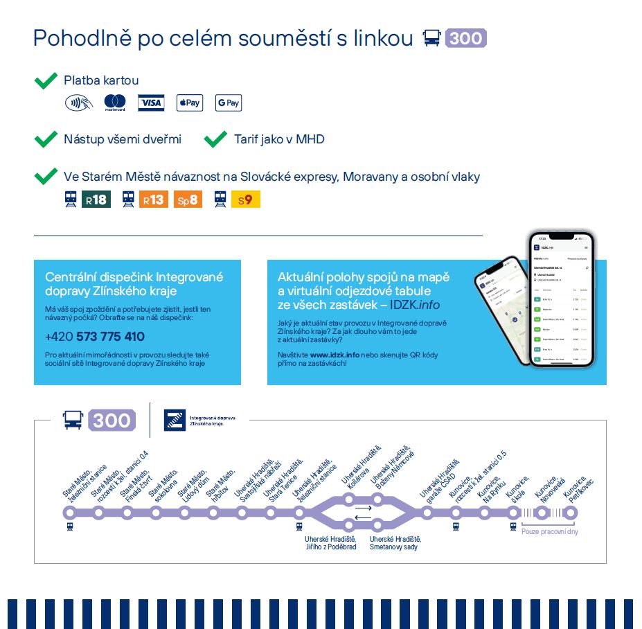 „Jízdní řád linky 300 je nastaven tak, aby právě ve Starém Městě navazovaly autobusy na příjezdy i odjezdy osobních vlaků Břeclav – Přerov, rychlíků Brno – Břeclav – Olomouc a rychlíků Luhačovice – Praha,“ informoval Martin Štětkář.