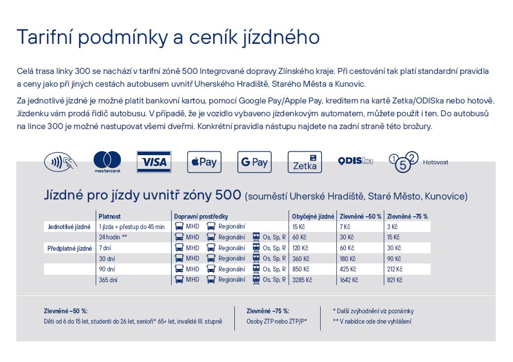 Trasa linky 300 se nachází v tarifní zóně 500 Integrované dopravy Zlínského kraje. Při cestování tak platí stejné ceny jako při jiných cestách autobusem uvnitř Uherského Hradiště, Starého Města a Kunovic. Jedna jízda s možností přestupu do 45 minut stojí 15 Kč. Na lince však nebude, stejně jako na jiných krajských linkách, platit jízdné zdarma u osob nad 70 let.