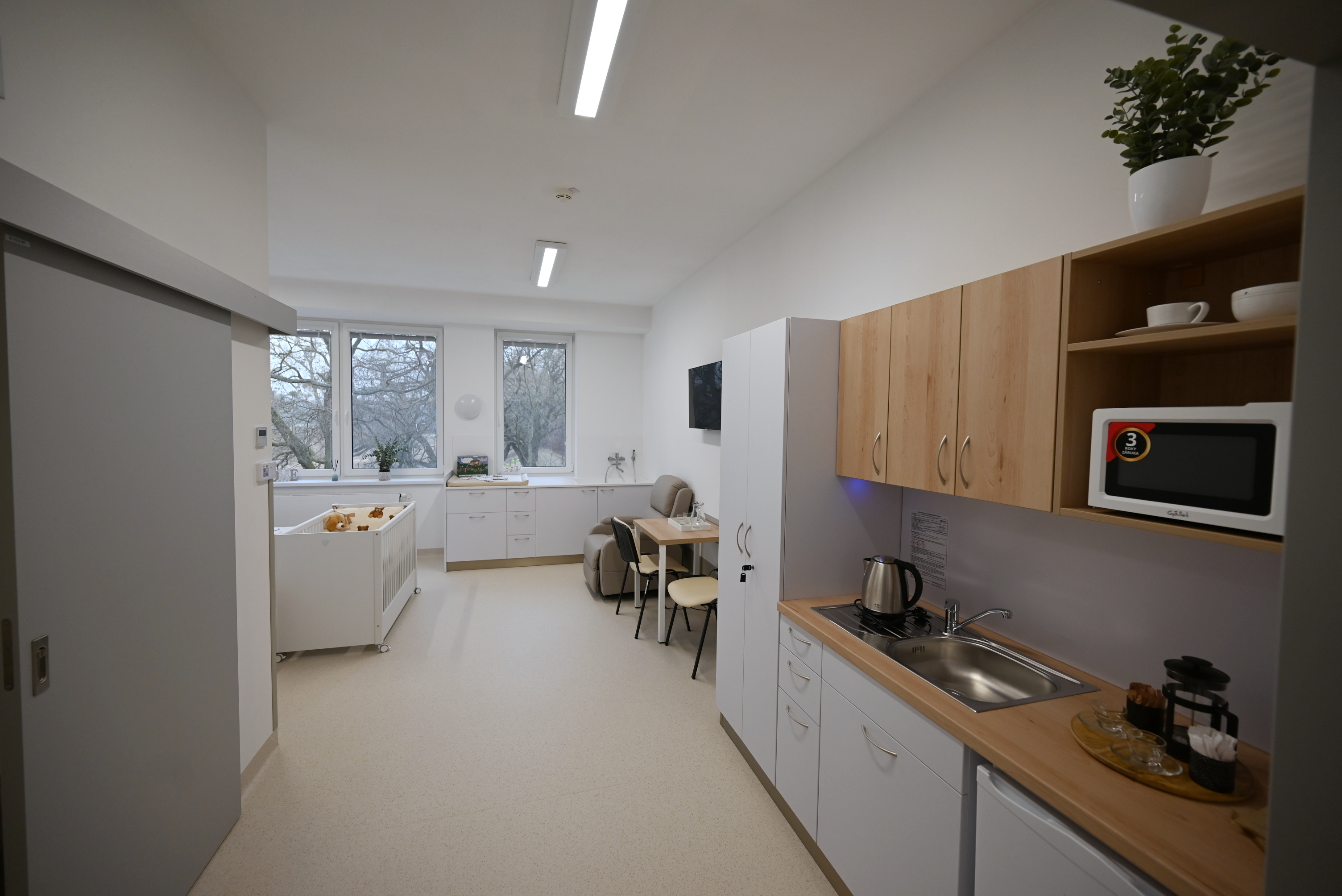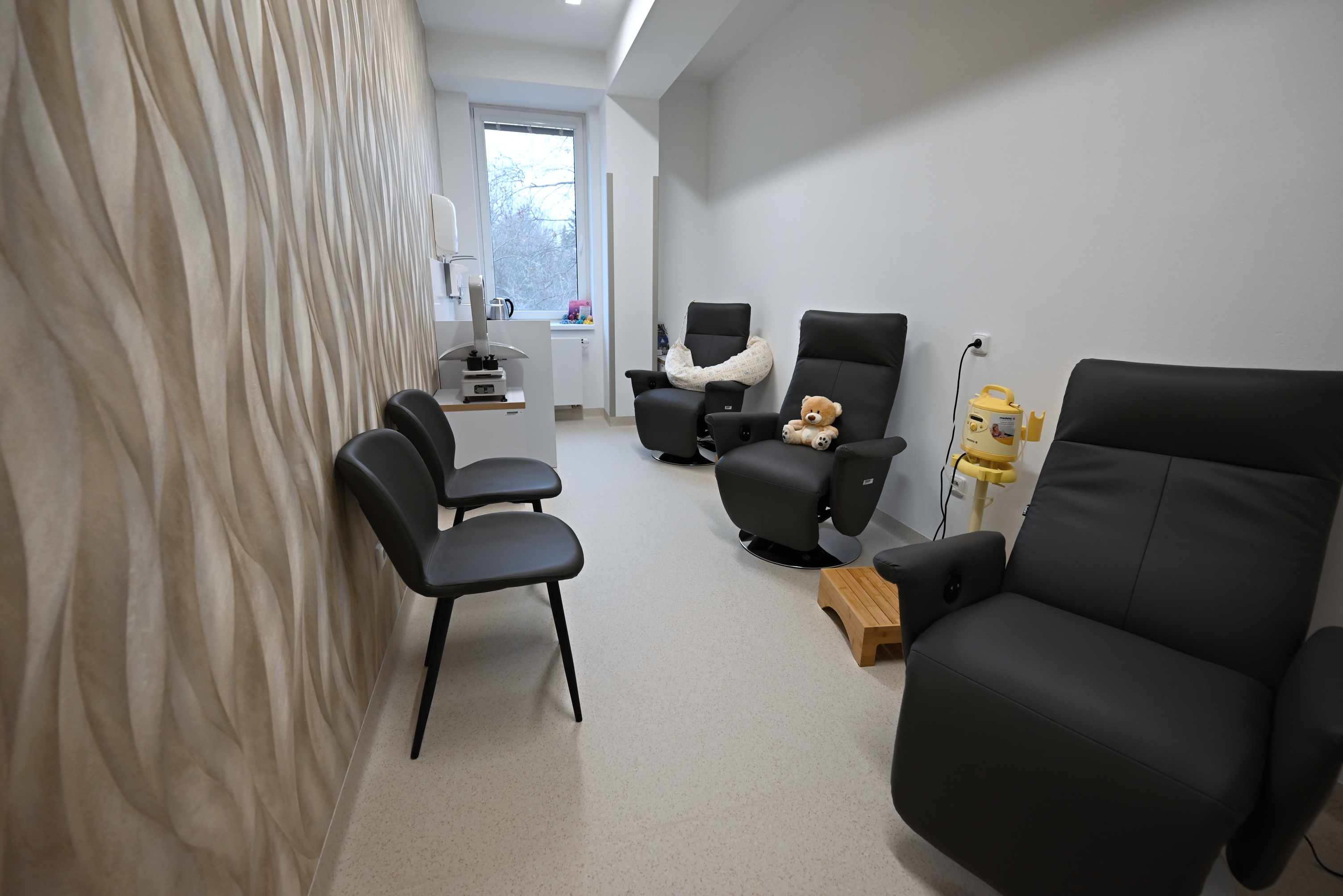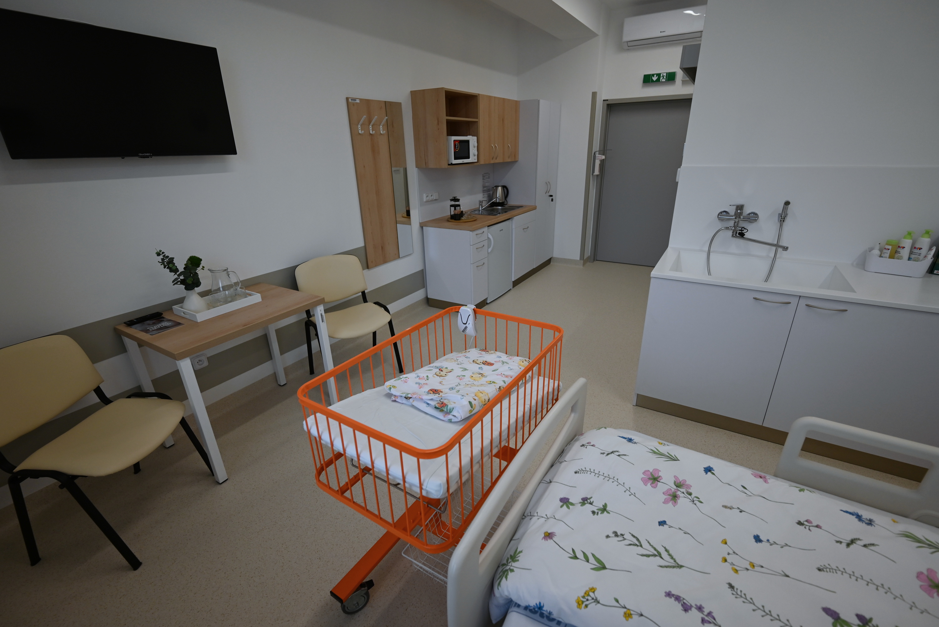 Nová přístavba porodnicko gynekologického oddělení nabízí například rodinné pokoje s manželskou postelí i možnou přistýlkou pro staršího sourozence. Nechybí zde pohodlné polohovatelné křeslo pro kojení a přebalovací pult, na nějž navazuje zabudovaná vanička pro koupání miminka.