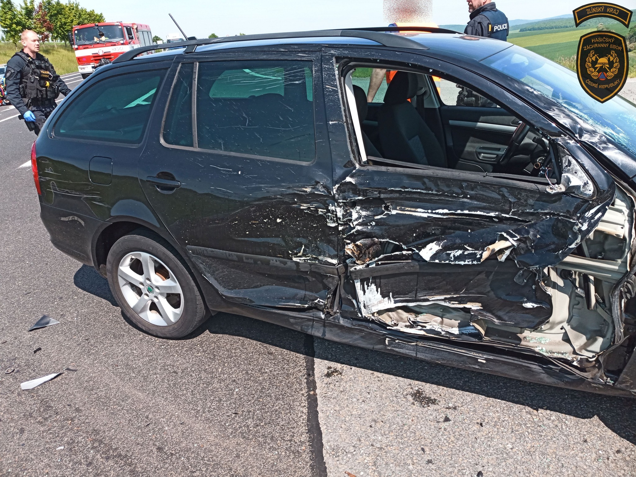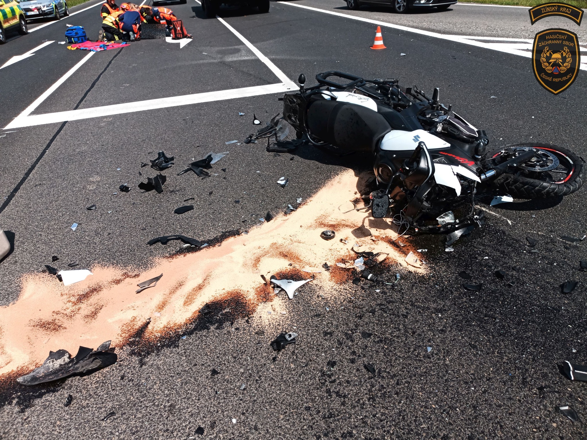 Jako první byli u nehody hasiči z Uherského Brodu, kteří společně s policisty poskytovali první předlékařskou pomoc zraněnému řidiči motocyklu.