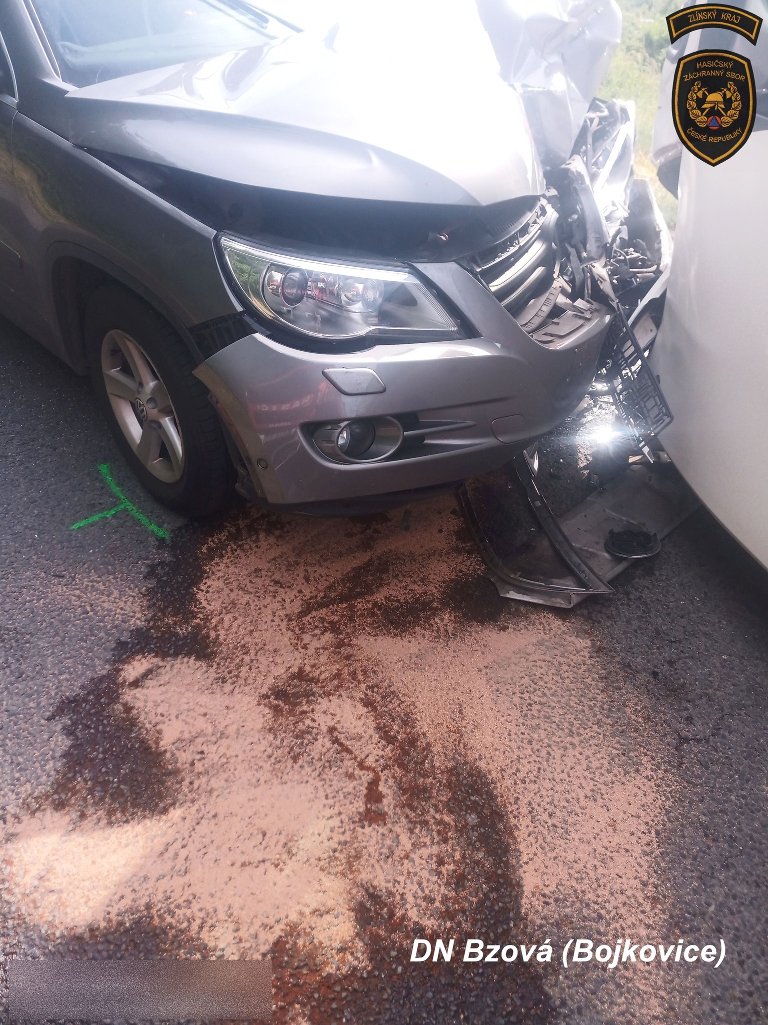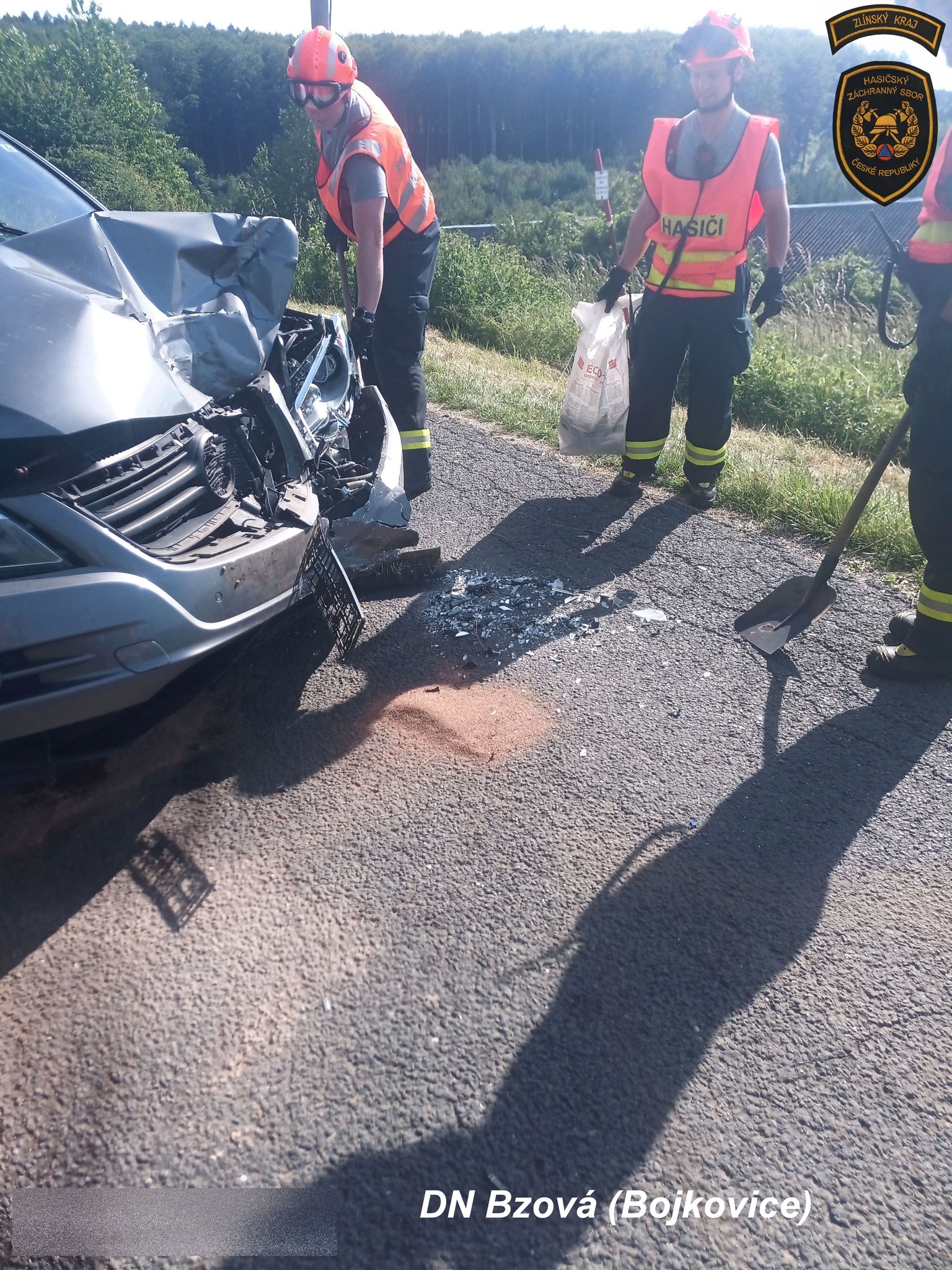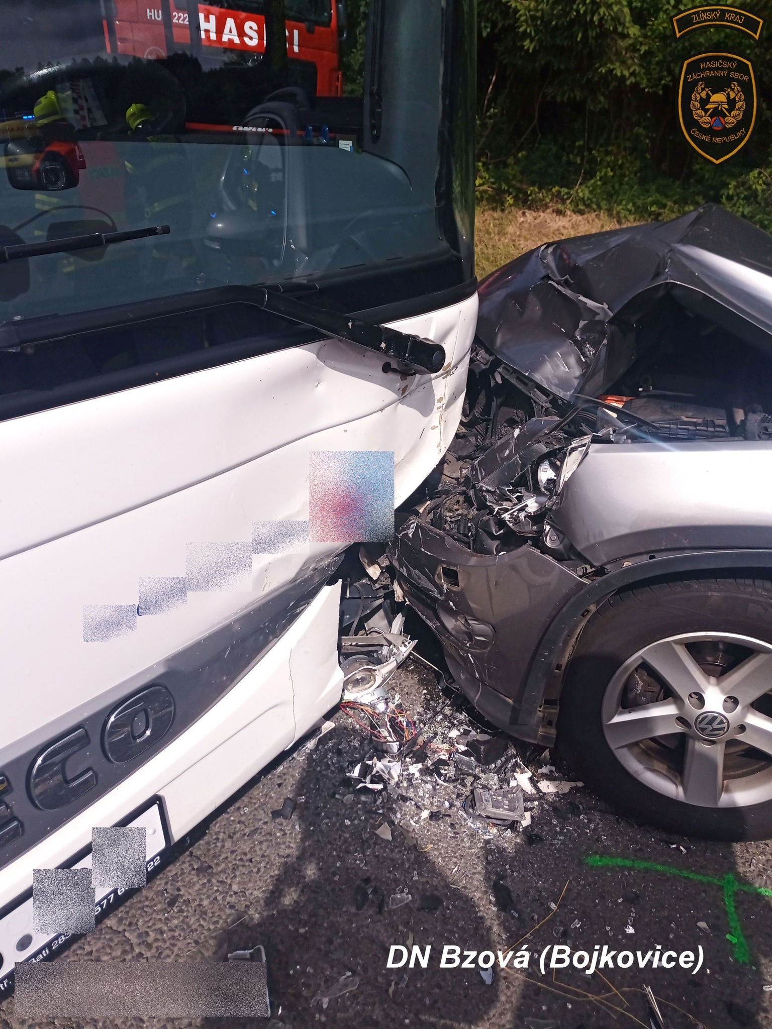 Další nehoda se udála v 15:10 u Bzové nedaleko Bojkovic, kde se srazilo osobní vozidlo s autobusem, ve kterém cestovalo 43 osob.