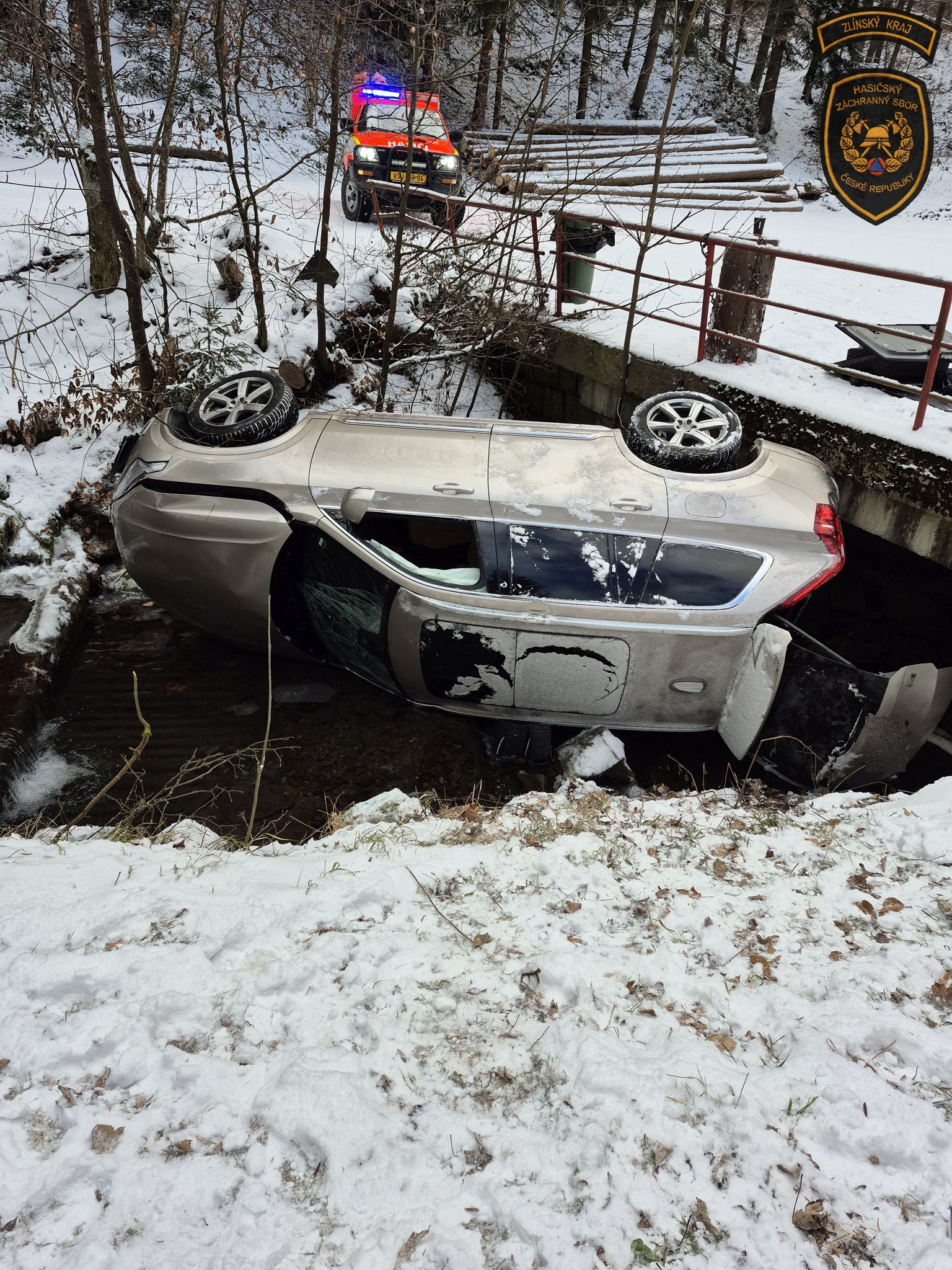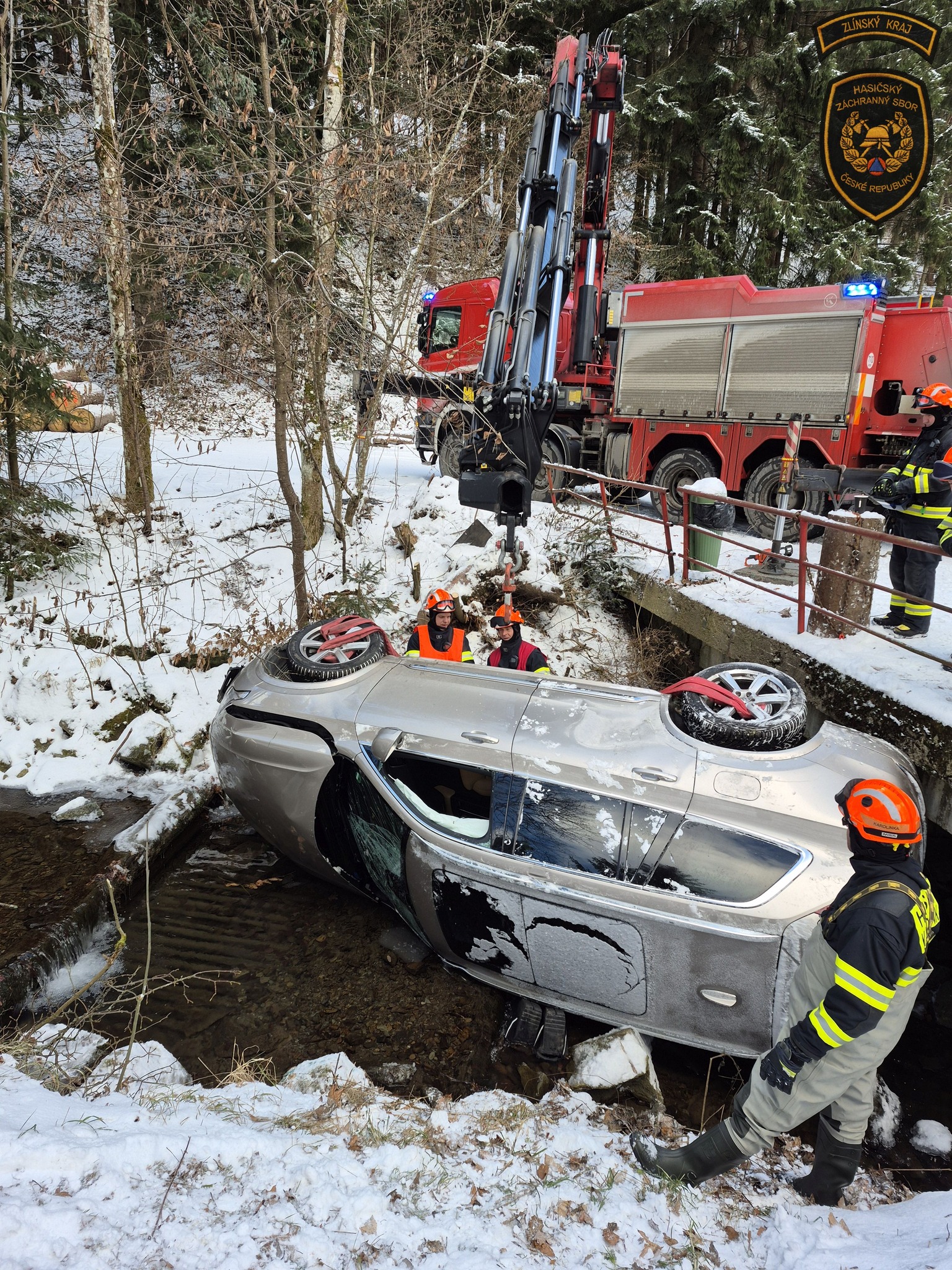 V úterý dopoledne vyjížděli hasiči do Velkých Karlovic k autonehodě, během které vůz sjel ze silnice a skončil na boku v místním potoce.