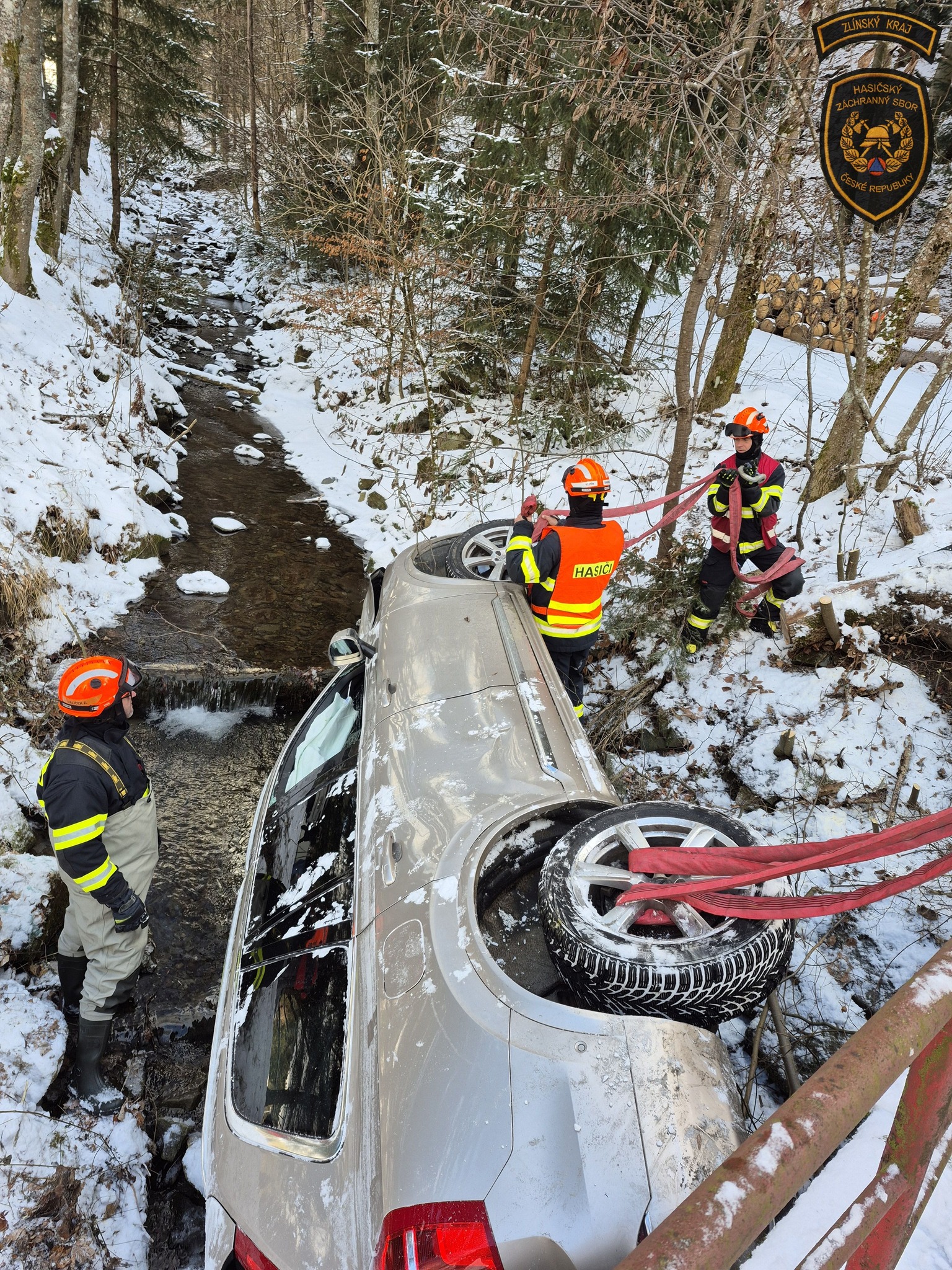 V úterý vyráželi hasiči na pomoc řidičce, která se svým vozem skončila v korytě potoka ve Velkých Karlovicích. Řidičce se před příjezdem jednotek kupodivu podařilo z vraku dostat vlastními silami a bez zranění.