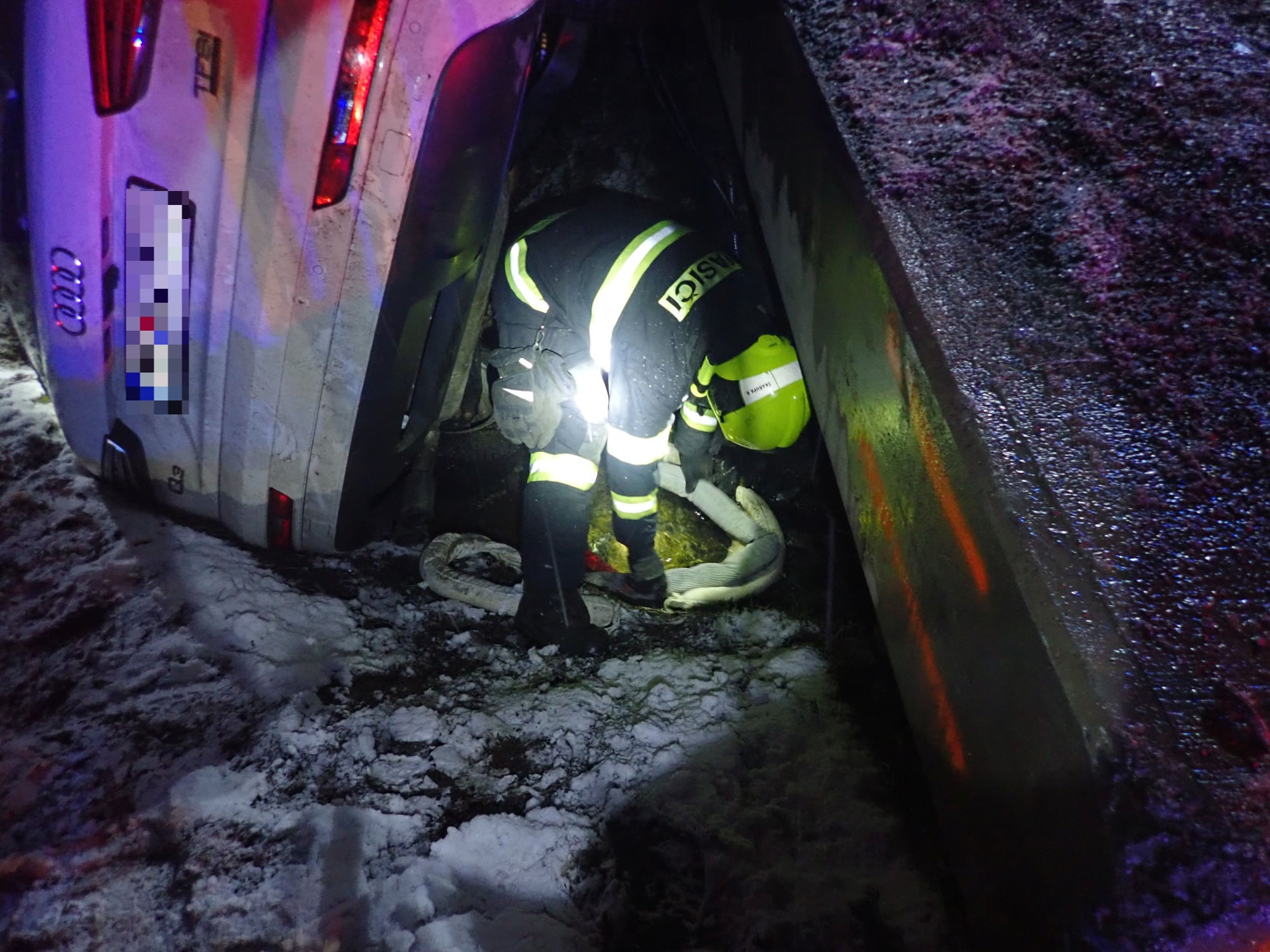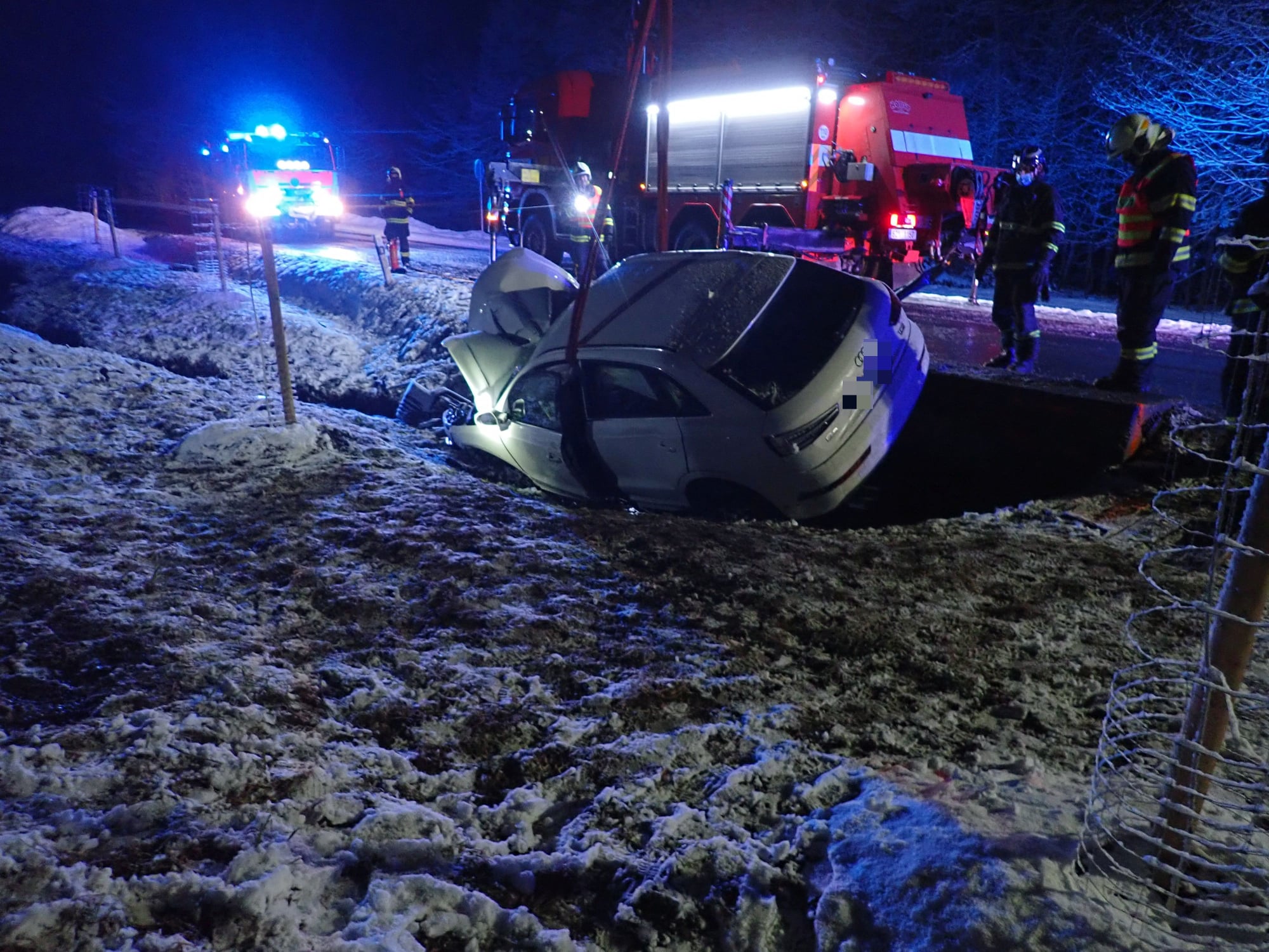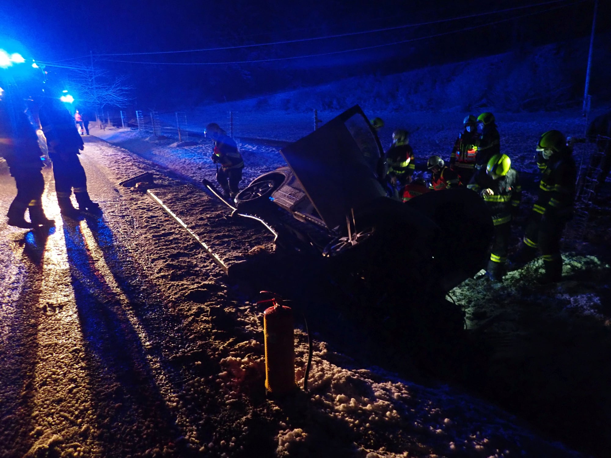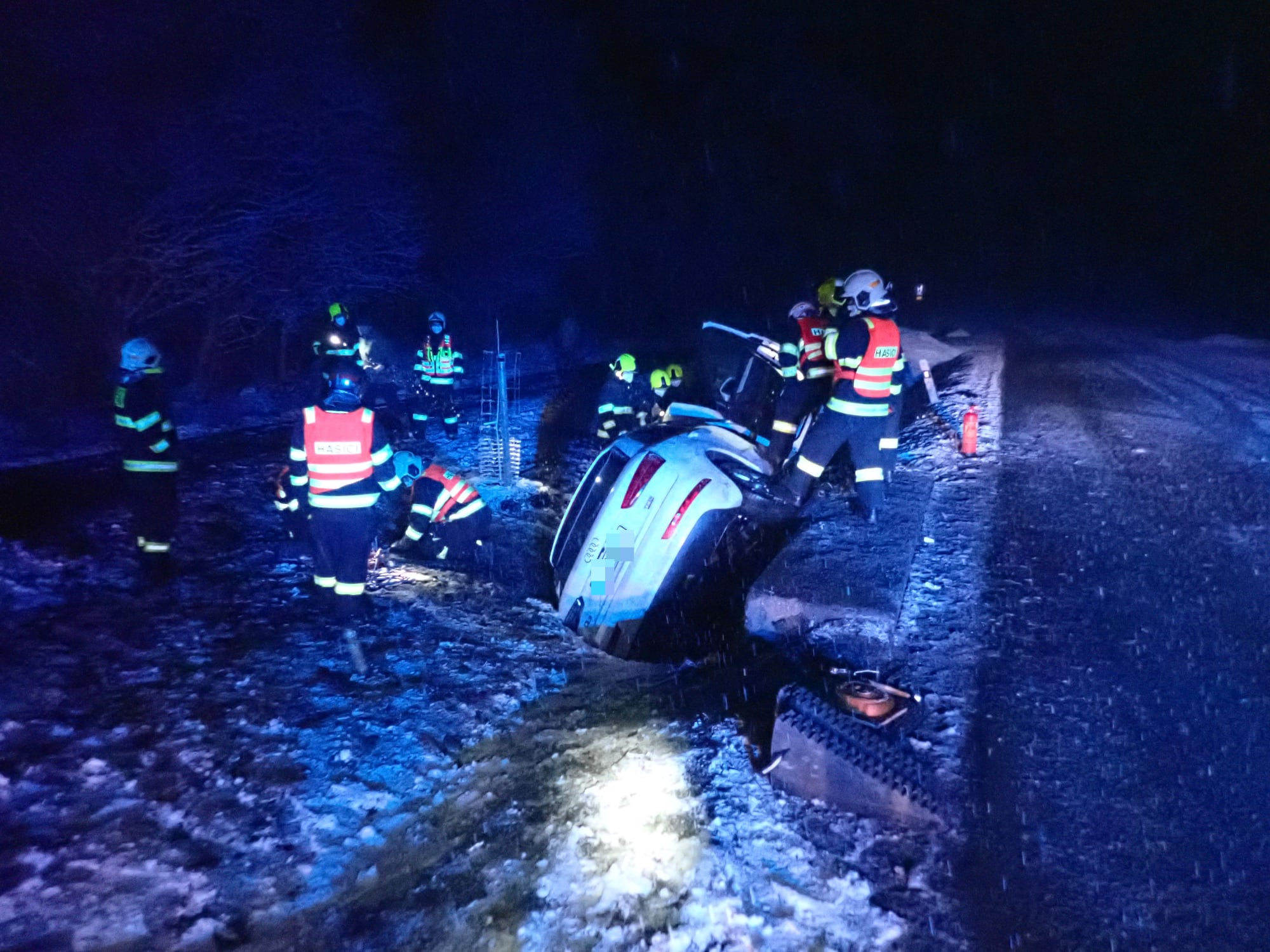Dnes krátce po půlnoci došlo k dopravní nehodě osobního vozidla do příkopu na komunikaci, spojující obec Velké Karlovice se státní hranicí. Na místo byli vysláni profesionální hasiči ze stanice Vsetín a dobrovolní hasiči města Karolinka. Po příjezdu hasiči průzkumem zjistili, že vozidlo se nachází v příkopu a leží na boku. Ve vozidle se před nehodou nacházely 2 osoby. Jednu z nich museli hasiči vyprostit pomocí pneumatických zvedacích vaků. Obě osoby byly při nehodě zraněny, a proto si je do péče převzala zdravotnická záchranná služba a odvezla je do nemocnice k dalšímu ošetření.