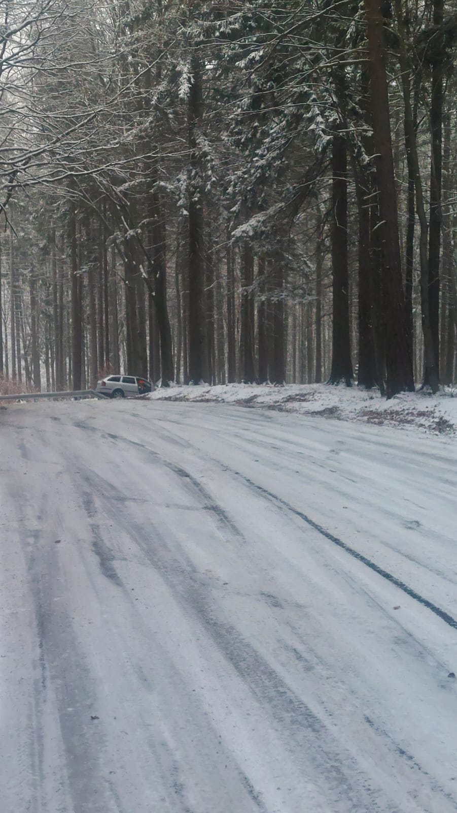 Jedna taková nehoda se zde stala minulý pátek v odpoledních hodinách. Řidič osobního auta na souvisle zledovatělé silnici nezvládl řízení a skončil s vozidlem mimo komunikaci, kde naboural do stromu.