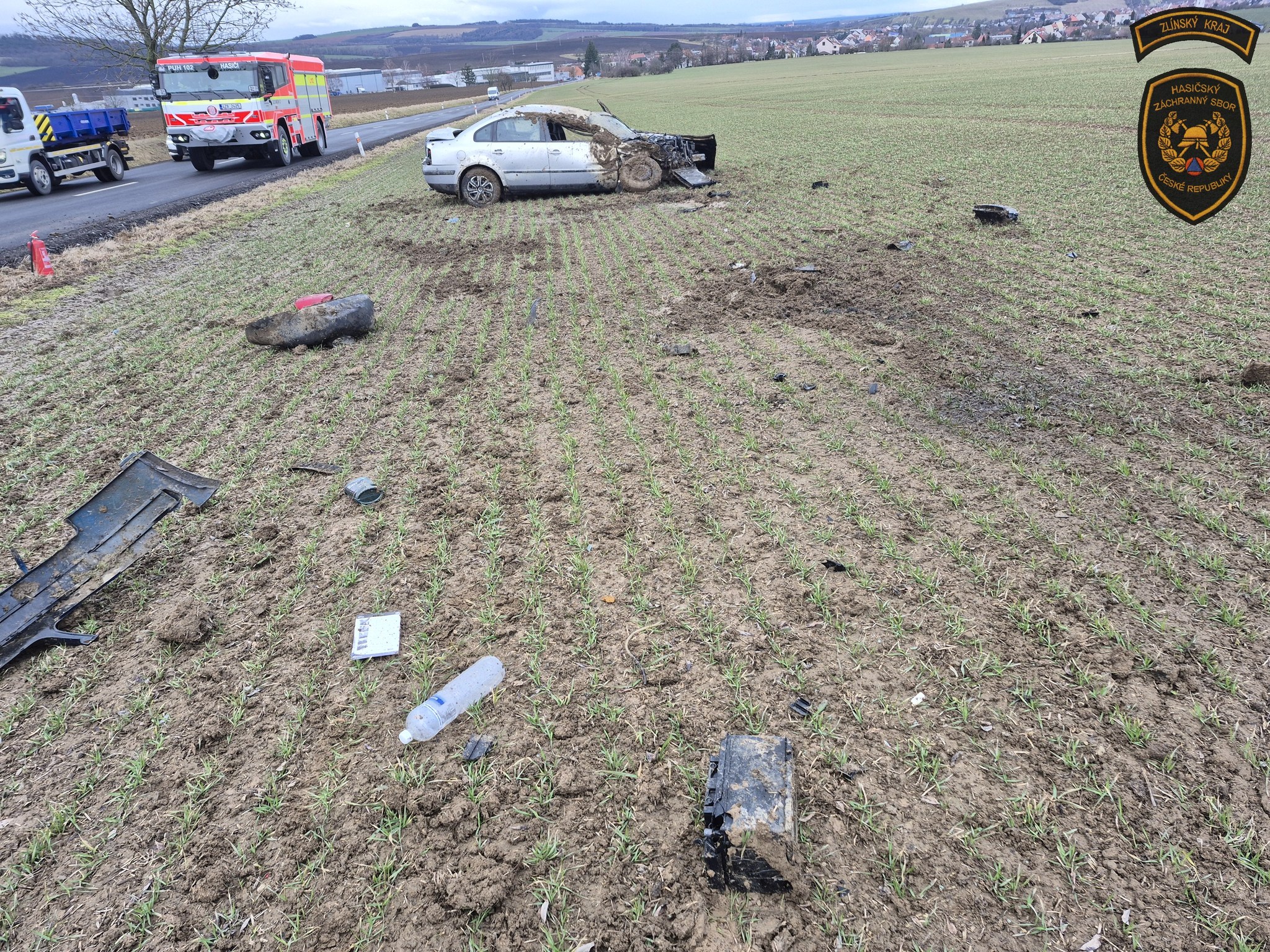 Osobní vozidlo skončilo po nehodě v poli, jeden člověk se zranil
