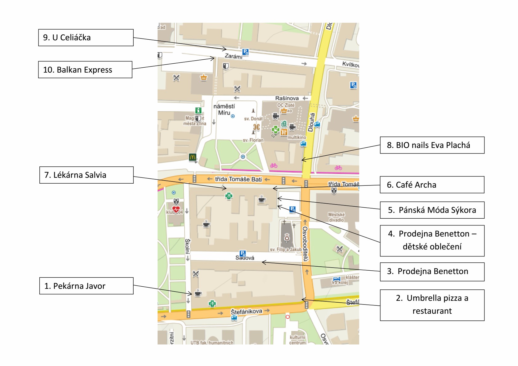 V každé výloze s výtvarnými instalacemi najdete mapu odkazující na další místa, kde jsou díla žáků k vidění. Celkem se do projektu zapojilo deset prodejen a restaurací. Každá výloha představuje ucelenou výstavu žáků, jednotlivých učitelů a středisek, kde ZUŠ Morava se svou koncepcí „učitel za žákem” vyučuje. Můžete se tak seznámit s plošnou a prostorovou tvorbou různých technik mladých umělců např. z Velkého Ořechova, Fryštáku, Želechovic nad Dřevnicí, Hošťálkové, Ratiboře, Kateřinic či Liptálu.