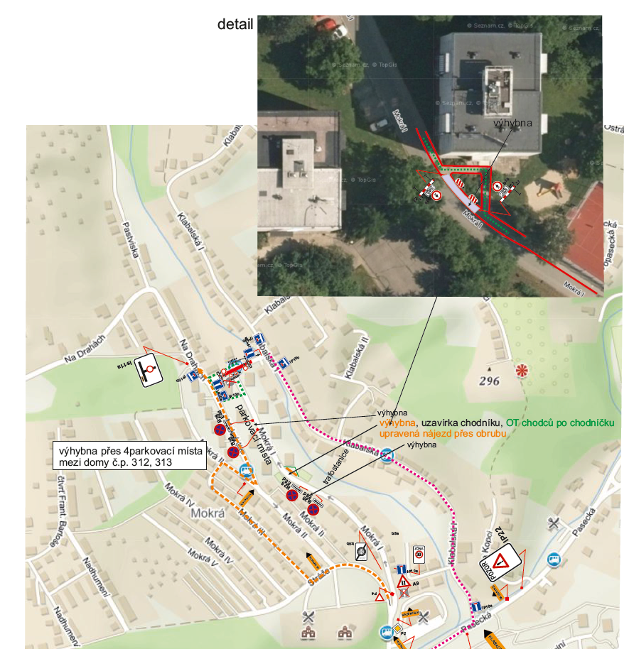 Důvodem pro dočasnou úpravu veřejné dopravy je výstavba odlehčovací komory kanalizace, jejíž rozsah vyžaduje celkové uzavření ulice Na Drahách. Zastávky Klabalská, Na Drahách, Mokrá II a Mokrá tak budou obousměrně bez obsluhy MHD.