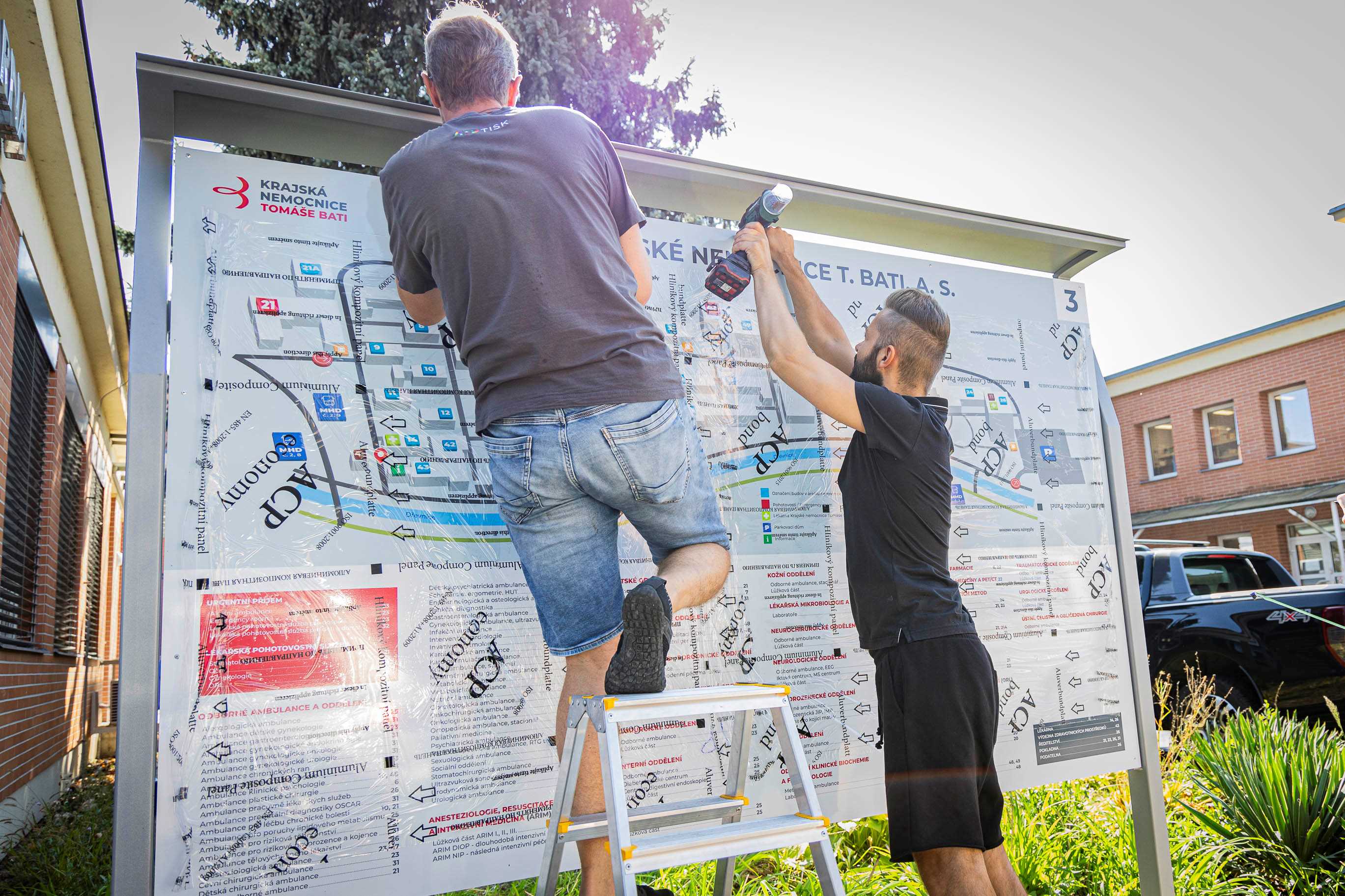 Celkem 15 nových cedulí a map je rozmístěno napříč celým areálem zlínské krajské nemocnice. Nahradily tak několik desítek let starý a nevyhovující původní orientační systém.