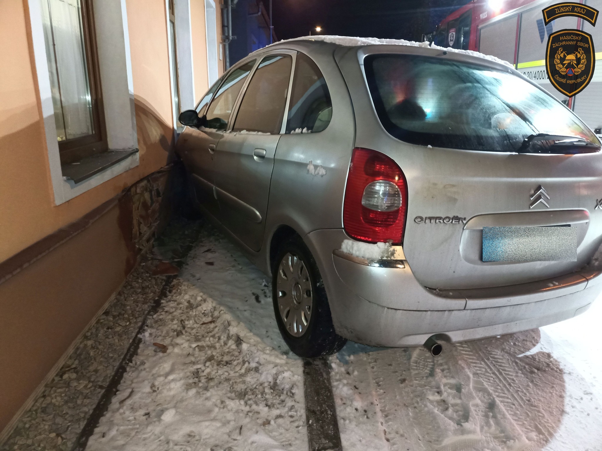 U čtvrté nehody zasahovali profesionální hasiči z Uherského Hradiště ve středu ráno v Buchlovicích, kde v ulici Tyršova skončilo vozidlo ve stěně rodinného domu.