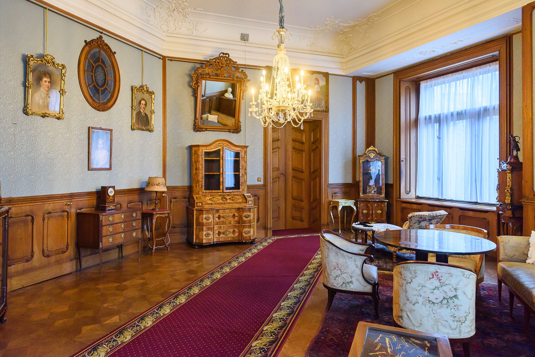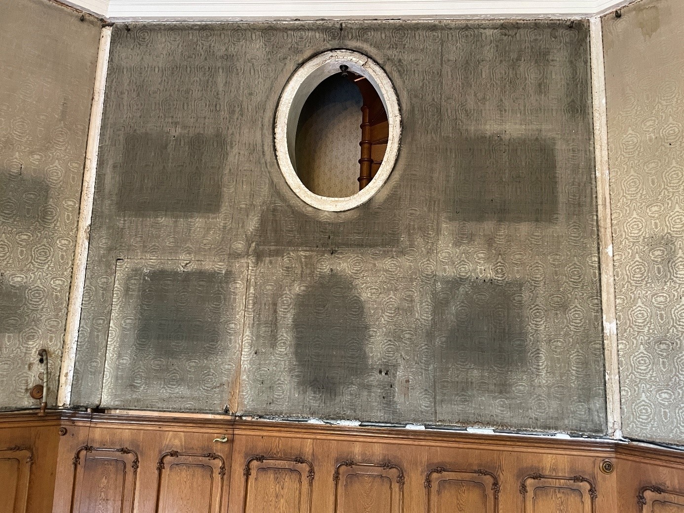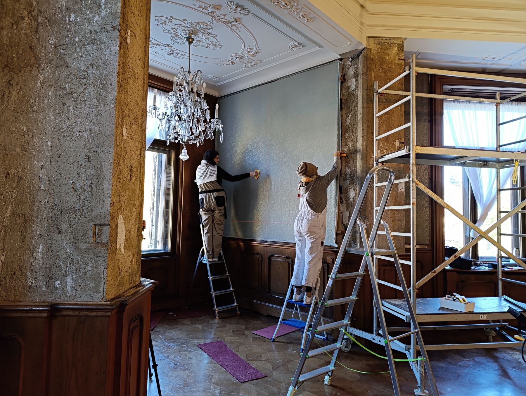 Původní tapety v Dámském salonu po odborném vyčistění, zafixování a zakrytí trhlin kompletně překryla nově utkaná replika látkové tapety.